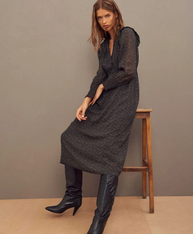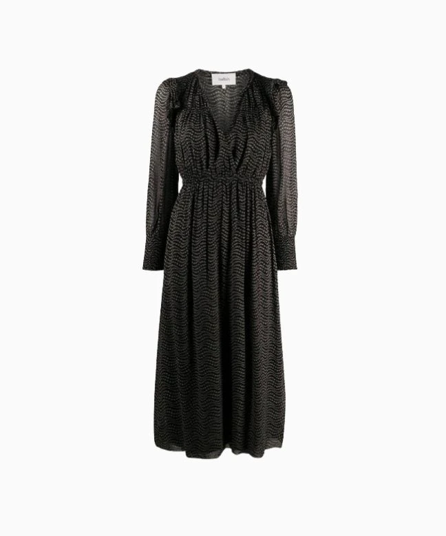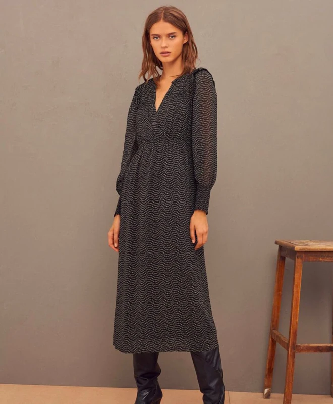 Robe Ba&sh, modèle Lucy. Cette jolie robe longue Ba&sh dans un imprimé noir à pois blanc wavy. La robe dispose de volants sur le buste et le jupon. Les manches sont légèrement bouffantes et resserrer aux poignets. Cette robe Ba&sh est disponible à la location unitaire ou avec l’abonnement Une Robe Un Soir.