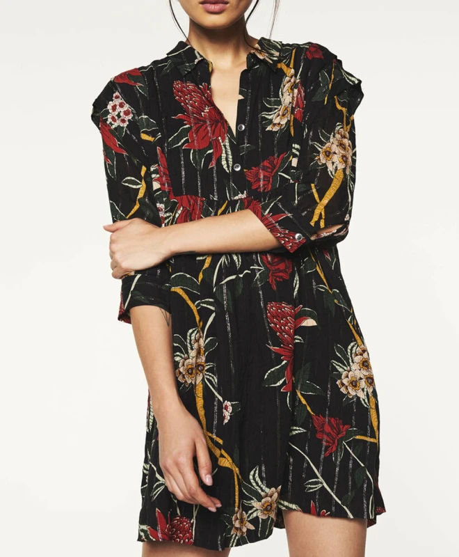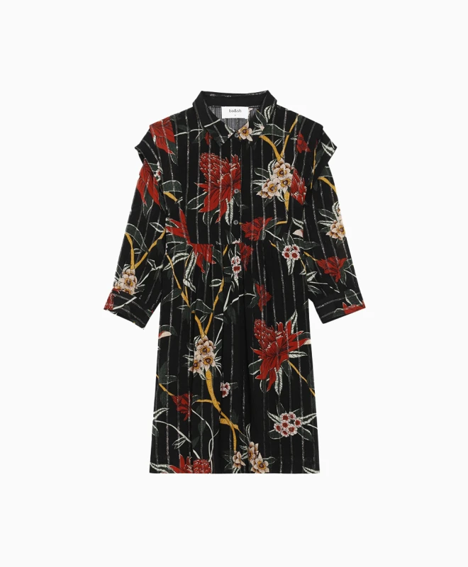 Robe Ba&sh, modèle Paprika. Cette jolie robe fleurie est confectionnée de fils métalliques. Elle possède deux manches 3/4 resserrées sur les avant-bras par des boutons de manchettes. Elle est dotée d’un col classique et d’une boutonnière sur le devant s’arrêtant à la taille. La robe vous arrivera au genou. Cette robe Ba&sh est disponible à la location par abonnement Une Robe Un Soir et à la location à l’unité.