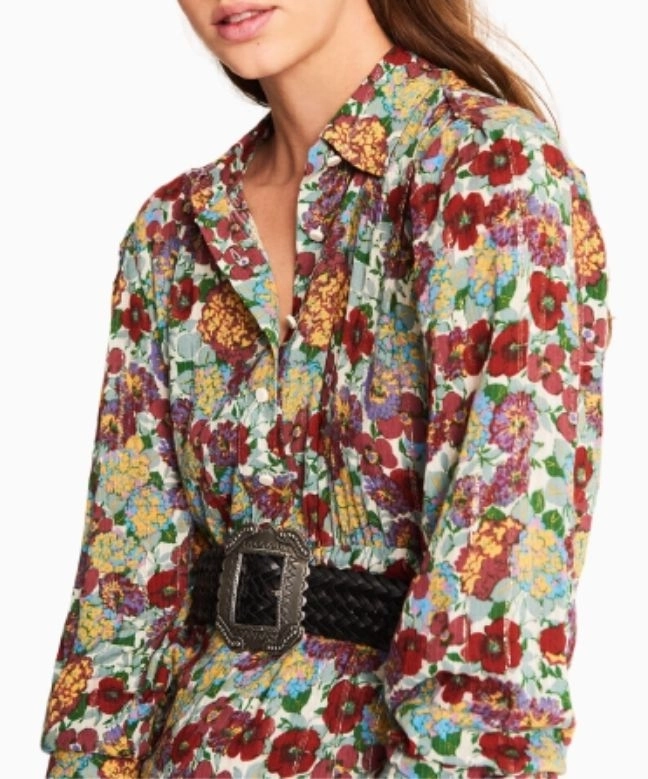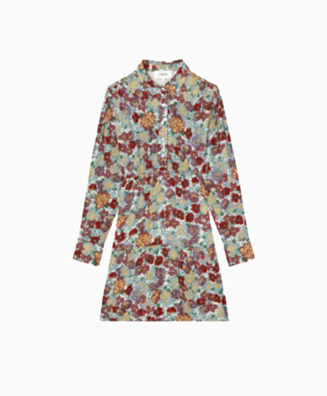 Robe Ba&sh, modèle Poldie Miel. Cette robe chemise dispose d’un col classique et de manches longues. La coupe est droite et peut être cintrée à l’aide d’une ceinture. L’imprimé floral est composé de fleurs multicolores et d’un fil doré pour ajouter une touche féminine. Cette robe Ba&sh est disponible en location à l’unité ou avec l’abonnement Une Robe Un Soir.