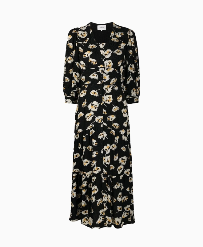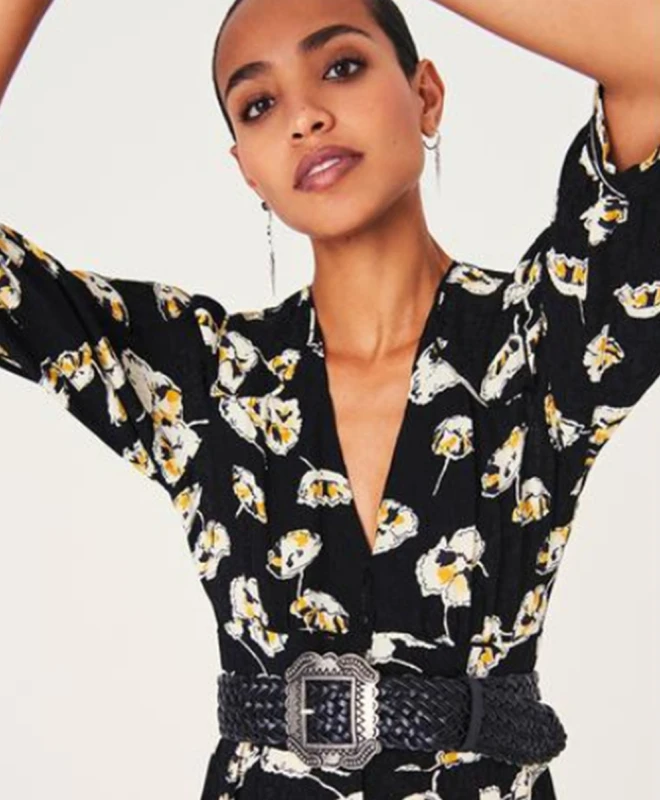 Robe Ba&Sh, modèle Ullia. Cette robe longue dispose de manches trois quarts, resserrĂ©es sous les coudes. Elle est dotĂ©e d’un col V pour mettre en valeur votre buste. Fluide et lĂ©gère, cette robe viendra mettre votre silhouette en valeur grâce Ă une taille marquĂ©e. Elle dispose Ă©galement d’une boutonnière de tout son long. Cette robe Ba&Sh est disponible Ă la location par abonnement Une Robe Un Soir et Ă la location Ă l’unitĂ©.