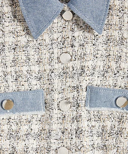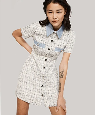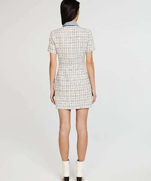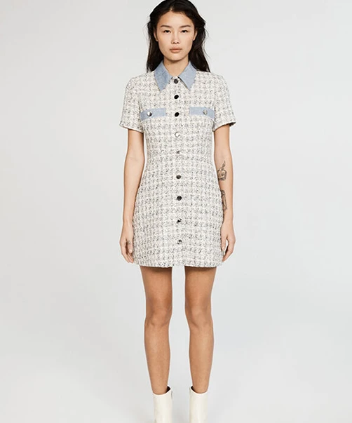 Robe Claudie Pierlot, modèle Ralf Tweed. Cette robe à manches courtes possède un col chemise de couleur bleu ciel, se distinguant ainsi de la couleur blanc cassé de la robe. Deux poches fermées et plaquées sont également présentes au niveau de la poitrine. Cette jolie robe se ferme par une boutonnière présente de tout son long. Chic et élégante, cette robe sera parfaite pour vos journées professionnelles ou bien pour une soirée chic. Associez-là à une paire de sandales à talons ouvertes ainsi qu’une pochette de couleur et le tour est joué ! Vous ne passerez pas inaperçue en la portant ! Cette robe Claudie Pierlot est disponible à la location par abonnement Une Robe Un soir et à la location à l’unité.