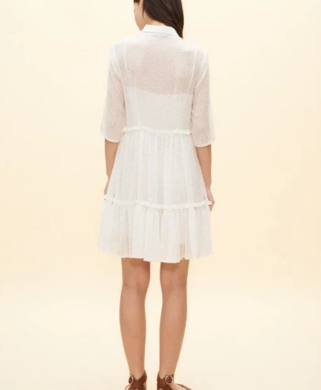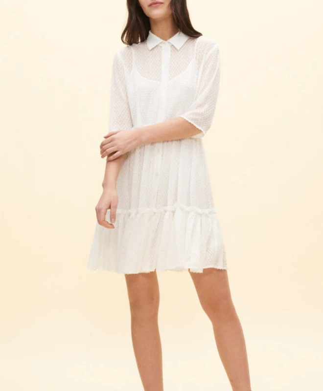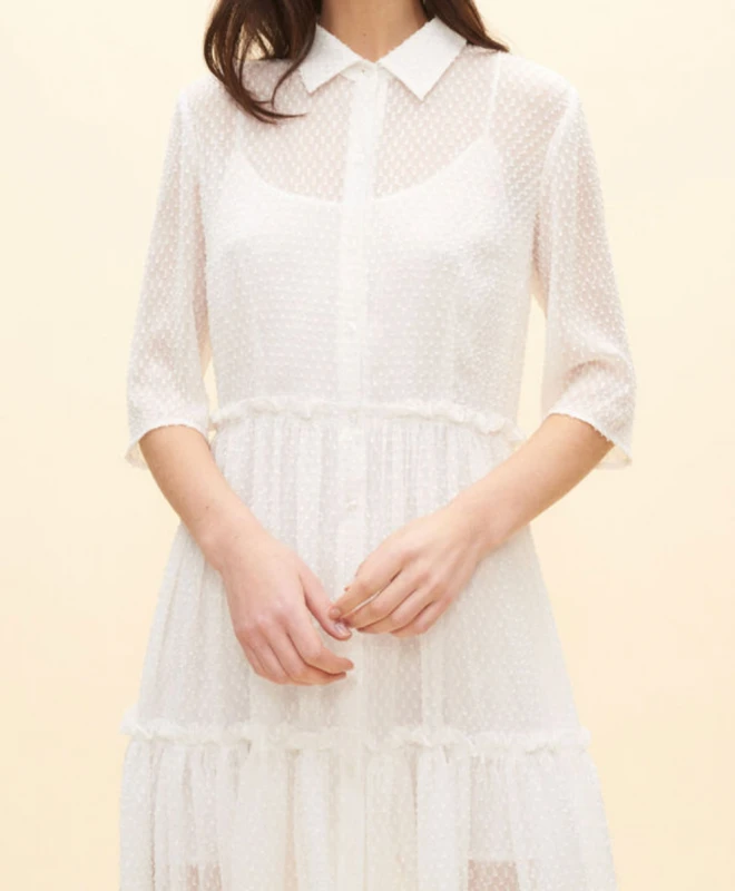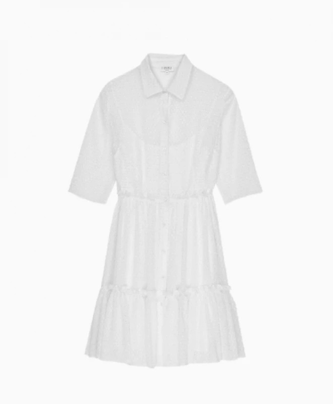 Robe Claudie Pierlot Modèle Randallbis. Cette robe chemise blanche dispose d’un col à revers et de manches 3/4. Elle est évasée puis volantée à partir de la taille. Elle possède également un fond de robe afin de ne pas être transparente. On aime le style romantique de cette robe chemise, à porter en journée ou en soirée pour un look élégant et féminin. La robe est disponible à la location pour tout abonnement Une Robe Un Soir.