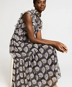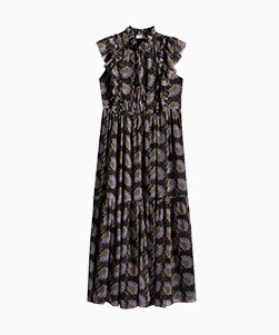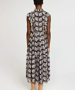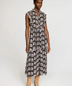 Robe Claudie Pierlot, modèle Recava. Cette robe longue sera parfaite pour vos vacances en bord de mer ou simplement pour les journées chaudes du printemps ! Sans manches, elle est dotée d’un col montant froncé. Il se ferme par un lien à nouer. Cintrée à la taille, la robe est fluide. Des détails plissés et froncés viennent se fondre dans ses motifs originaux. Dans le dos, vous retrouvez les mêmes détails que sur le col pour apporter une touche d’originalité. Associez-la à une paire de sandales plates pour un look décontracté, ou une paire de sandales à talons et une pochette noire pour un look plus chic. Cette robe se glissera parfaitement dans votre dressing printanier ! Cette robe Claudie Pierlot est disponible à la location par abonnement Une Robe Un soir et à la location à l’unité.