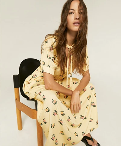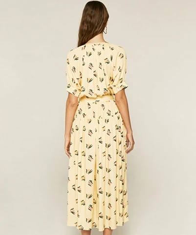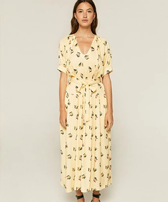 Robe Compania fantastica, modèle Yellow Peach. Cette robe longue dispose de manches courtes bouffantes et resserrées au-dessus des coudes. Le col de la robe est ouvert, mais peut se fermer grâce à un lien à nouer. Cintrée grâce à une ceinture élastique, la robe est également dotée d’une ceinture pour cacher l’élastique. La jupe de la robe est plissée pour apporter du volume. Souple et légère, cette robe peut se porter au quotidien avec une paire de baskets pour un look décontracté, ou une paire de sandales à talons pour un look plus élégant. Idéale pour les après-midi d’été, cette robe sera parfaite dans votre dressing ! Cette robe Compania Fantastica est disponible à la location par abonnement Une Robe Un Soir et à la location à l’unité.