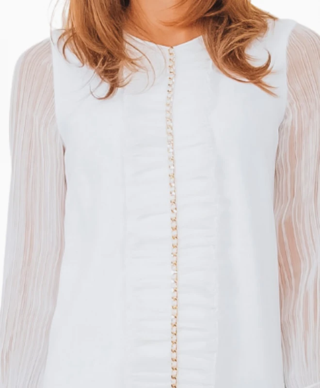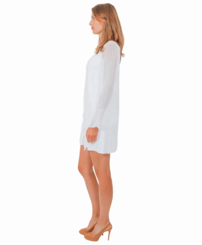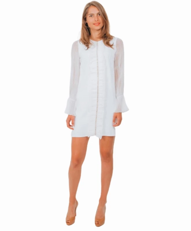 Robe courte ELISABETTA FRANCHI modèle Jane. Cette petite robe en crêpe blanche est dotée d’une coupe évasée et de manches froncées aux poignets pour une touche de romantisme. Sa micro-chaîne dorée vient habiller la robe qui se suffit à elle même pour un style moderne et glamour. La robe italienne est à louer pour un mariage civil, un cocktail ou une soirée. Avec cette robe, choisissez de porter les boucles d’oreilles Soko.