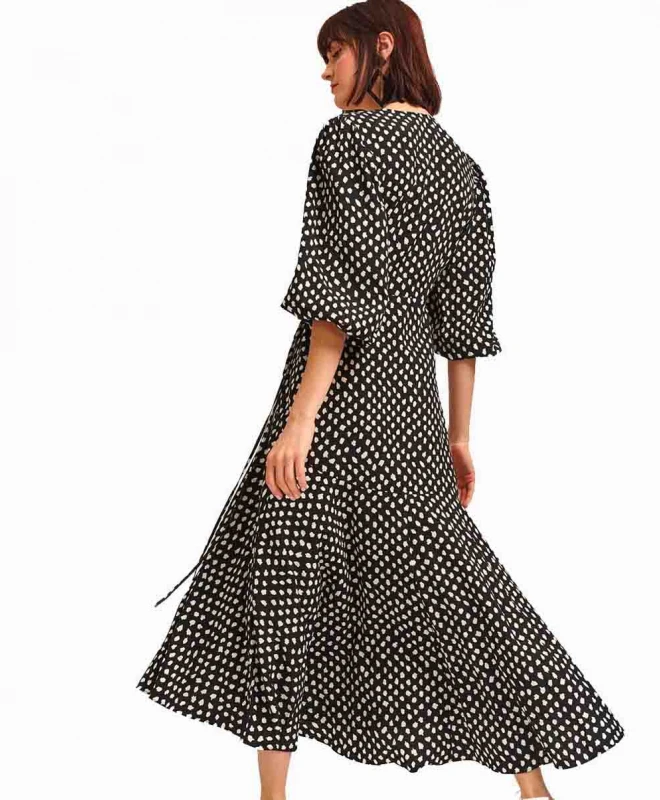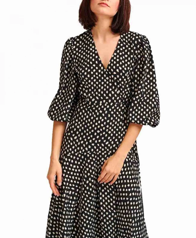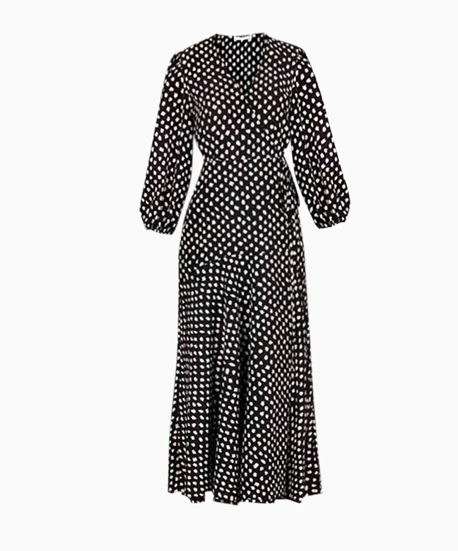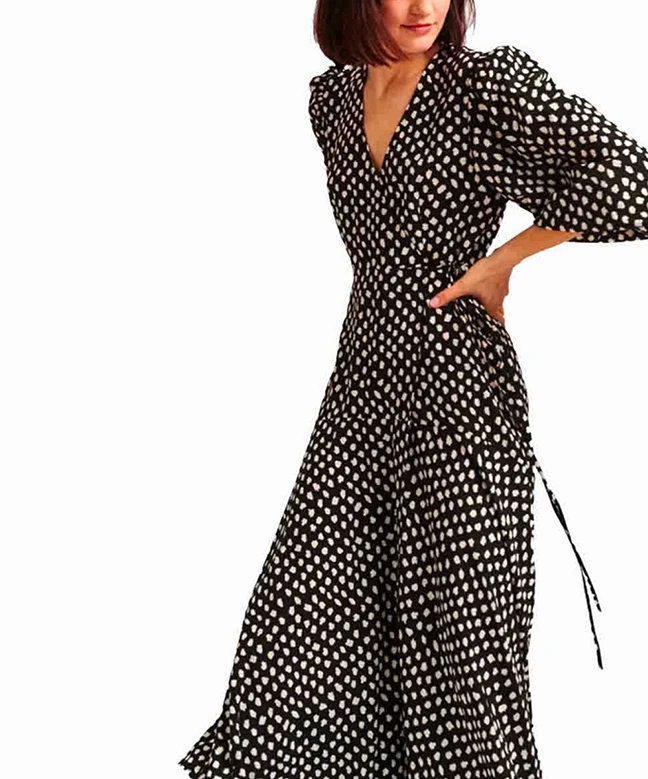Robe Essentiel Antwerp, modèle Vanessa. Cette robe longue, cache cœur, noir à un imprimé à pois blanc. Elle est composée d’épaules et de manches froncées, d’un ourlet asymétrique et d’une encolure en V. L’imprimé a été revisité, les pois ont été rendu flous tout en restant moderne et féminin. Cette pièce peut être portée en toutes saisons, en hiver avec des bottines et une veste et en été avec des sandales. Osez les imprimés grâce à l’abonnement.