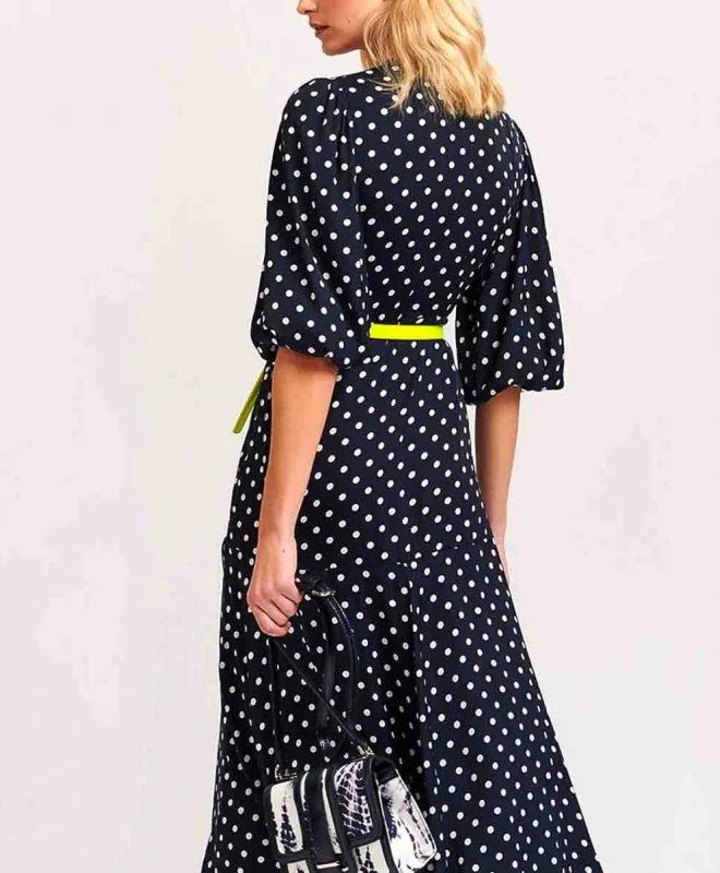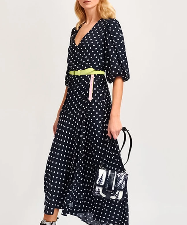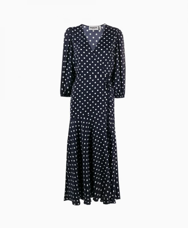 Robe Essentiel Antwerp, modèle Vundamental. Cette robe longue bleu marine à pois blanc est très féminine, elle saura mettre votre corps en valeur. Elle est flatteuse et confortable ! Ce vêtement est asymétrique, elle a une coupe portefeuille et un décolleté en V plongeant. Une ceinture peut être ajoutée pour accentuer la taille, elle peut aussi être portée ample pour plus de confort. Une robe qui se porte aussi bien pour aller au bureau tous les jours, que lors de sorties le week-end. C’est une pièce de choix à ajouter à votre sélection du mois pour votre box de location de vêtements.