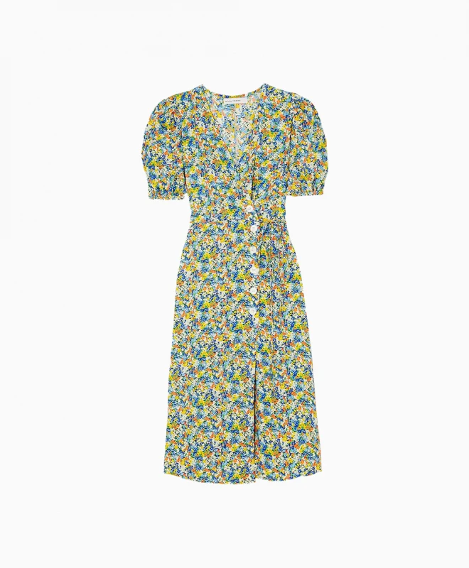 Robe FAITHFULL THE BRAND, modèle Franny. Cette robe est faite de crêpe légèrement froissé à motifs de fleurs inspirés des années 70. Elle est tracée avec des fermetures à boutons sur le devant de la robe et présente un col en V avec des manches bouffantes froncées. Portez-la avec des sandales neutres pour compléter l’imprimé vert, bleu et blanc. Osez les imprimés et les couleurs sans risque de vous lasser grâce à l’abonnement.