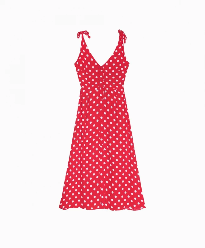 Robe Frnch, modèle Adnise. Cette robe rouge avec son motif à pois blanc indémodable, s’inspire du style mythique pin-up américaines. Elle est composée de poches latérales, d’un col en « V », s’ouvre grâce à des boutons présents tout le long et elle possède des bretelles réglables. Vous pouvez la porter avec des sandales à talon vernies et un petit bandana sur les cheveux. Adoptez un look chic et rétro avec la location de vêtement et l’abonnement Une Robe Un Soir.