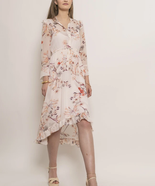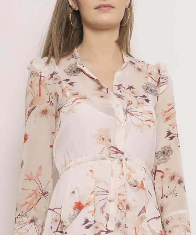 Robe Maje modèle Printemps. Cette robe midi fleurie est légère et fluide. Sa couleur et ses motifs sont très printaniers, c’est la robe parfaite pour la saison ! Elle dispose d’un décolleté en V avec pattes de boutonnage et de manches 3/4 ressérées aux poignets. Des volants sont brodés sur les épaules et en bas de la jupe. Vous pouvez ajuster la robe à la taille grâce à un discret noeud ton sur ton. Elle possède également un fond de robe intégré. Elle est disponible à la location grâce à votre abonnement Une Robe Un Soir ou à la location unitaire.