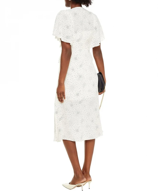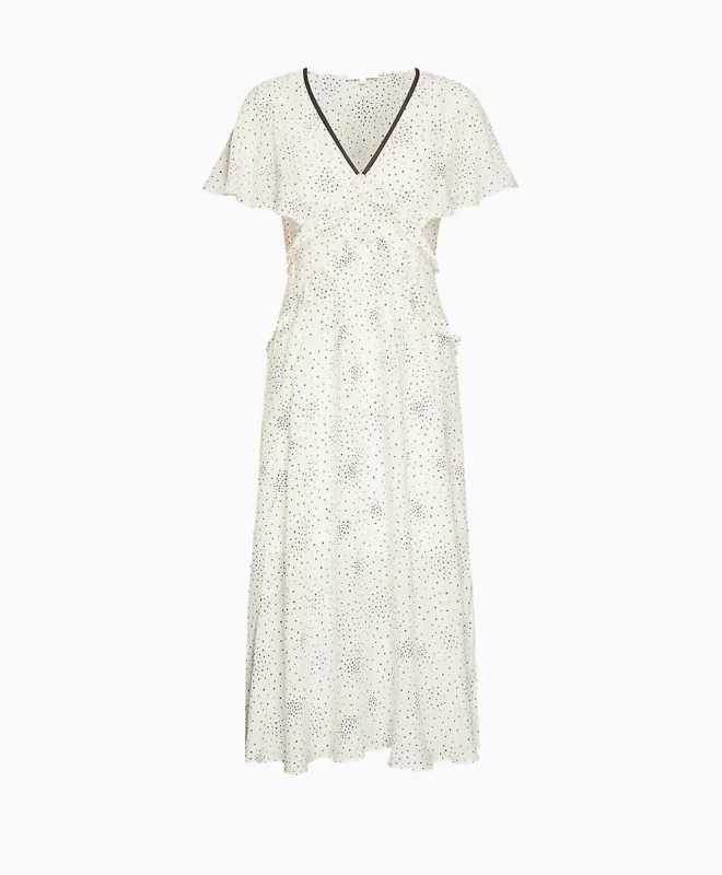 Robe Maje, modèle Racky. Cette jolie robe midi sera parfaite pour la saison estivale. Dotée de manches courtes évasées et fluides et d’un col V, cette s’adaptera parfaitement à votre silhouette et viendra compléter votre dressing ! Cette robe Maje est disponible à la location par la box de vetement Une Robe Un soir ainsi qu’à la location à l’unité.
