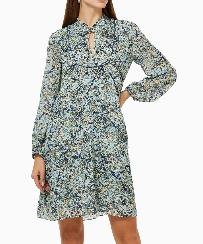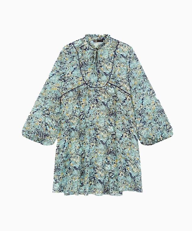 Robe Maje, modèle Reladon. Cette robe courte fluide Maje propose un imprimé fleuri bleu et vert. Elle dispose de manches longues amples avec des élastiques aux poignets. La robe est droite avec un col en V munie de liens et de volants. Portée avec des baskets ou des sandales, cette robe Maje est disponible avec l’abonnement Une Robe Un Soir ou à la location unitaire.