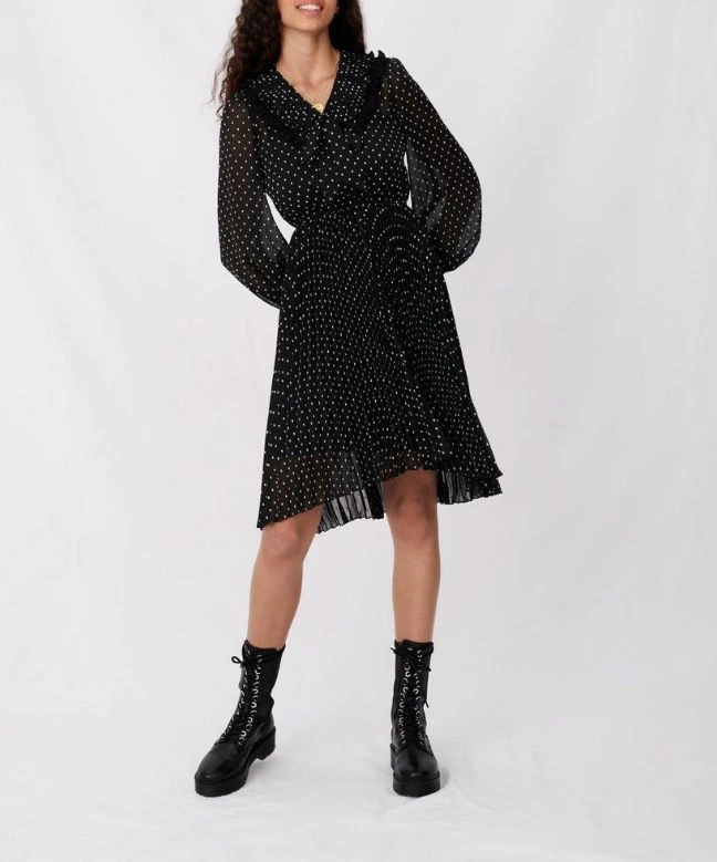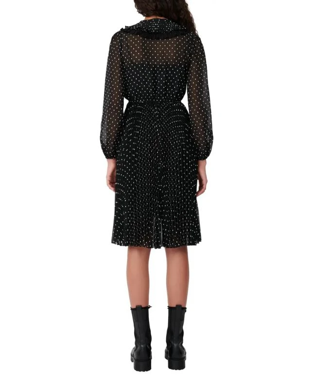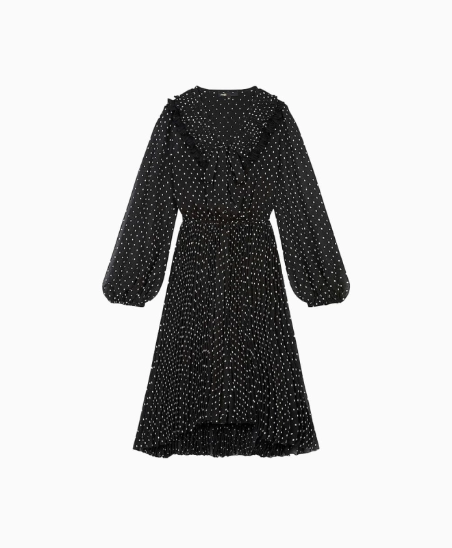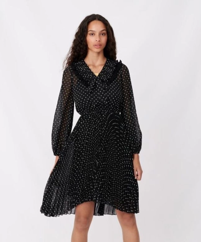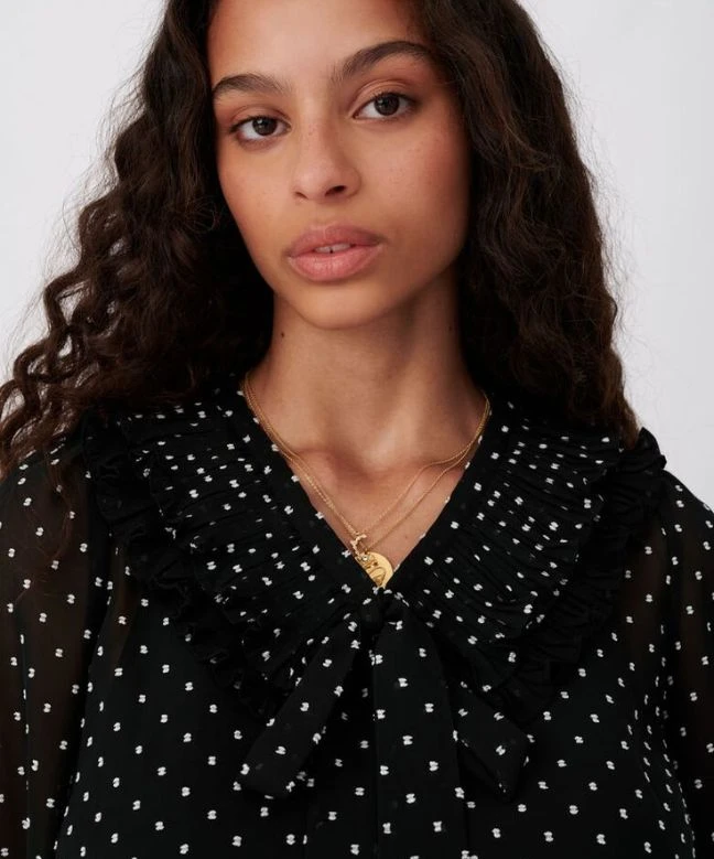 Robe Maje, modèle Ribul. Cette robe noire imprimée fleurie, dispose de manches longues bouffantes, ainsi que d’un col ouvert avec des volants. Cette robe est fluide et resserrée à la taille. Transparente dans le dos et sur les manches, la robe viendra parfaitement épouser votre silhouette. Cette robe peut être portée aussi bien avec une paire de talons aiguilles, qu’avec une paire de baskets pour un look plus décontractée. Idéale pour une soirée entre amis ou simplement pour vous rendre au travail, cette robe intemporelle viendra compléter votre dressing. Cette robe Maje est disponible à la location par abonnement Une Robe Un soir, et aussi à la location.