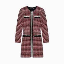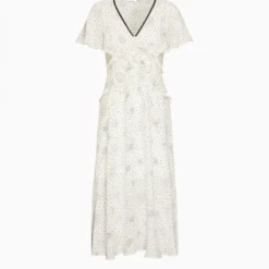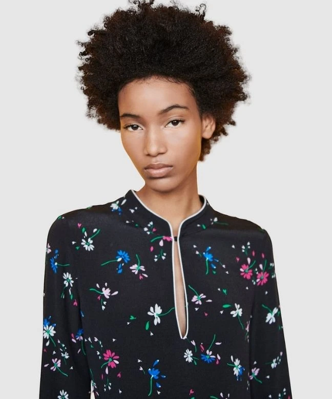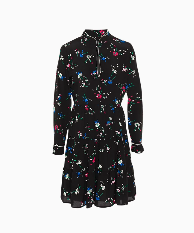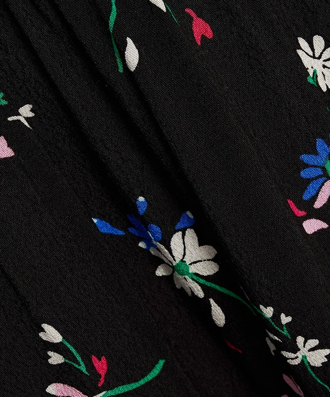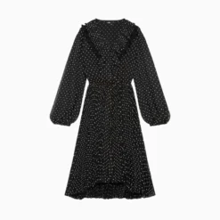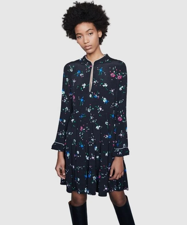 Robe Maje, modèle Rilita. Cette robe courte confectionnée en crêpe noire est ornée d’un motif floral délicat. Elle présente un col en V, des manches longues avec des volants aux poignets et une fermeture à glissière dissimulée. Sa taille est cintrée et flatte parfaitement la silhouette. Intemporelle du dressing féminin, la petite robe noire est un indispensable parfaite toutes saisons !