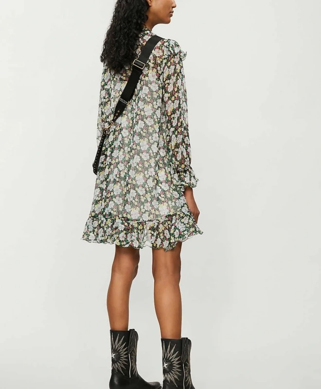 Robe Maje Modèle Rullina. Cette robe en soie à motifs fleuris dispose d’un col à volants et de manches longues à poignets froncées. Elle possède une coupe ample mais vous pouvez affiner votre taille en choisissant une ceinture parmi notre large choix d’accessoires de créateurs.Elle est disponible à la location pour tout abonnement Une Robe Un Soir.
