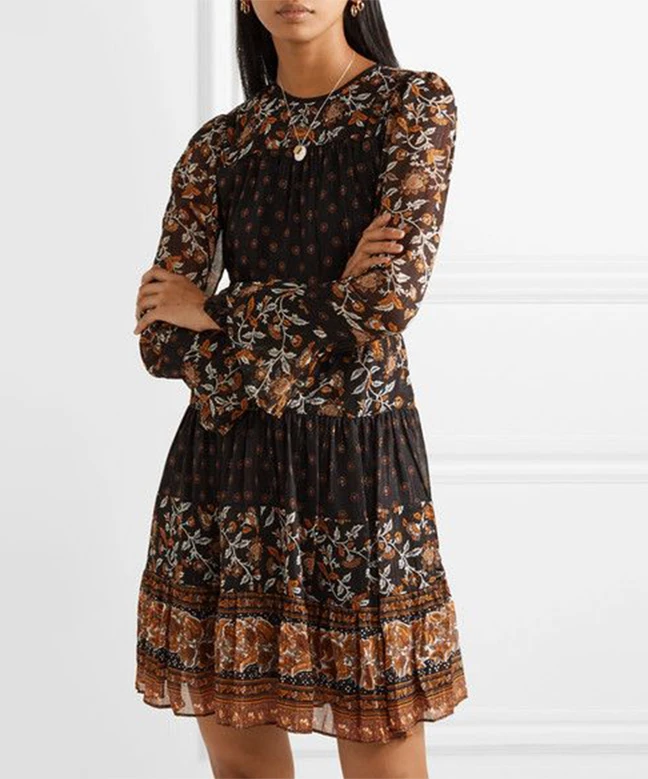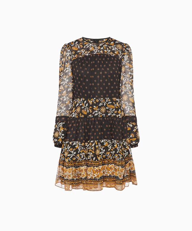 Robe Michael Kors, modèle Georgette Botanique. Cette robe courte est rĂ©alisĂ©e dans des mĂ©langes de tissus Ă imprimĂ©s botaniques frais et contrastĂ©e ce qui la rend très originale. Elle est composĂ©e d’une coupe ample, de volants, d’une doublure, de poignets Ă©lastiquĂ©s, d’un col rond et d’une fermeture Ă©clair dissimulĂ©e Ă l’arrière. Cette pièce sera votre ailĂ©e de la rentrĂ©e, vous pourrez l’associer avec des bottes hautes et un petit sac pour un look bohème chic. Cette robe est disponible Ă la location unitaire et avec l’abonnement Une Robe Un Soir.