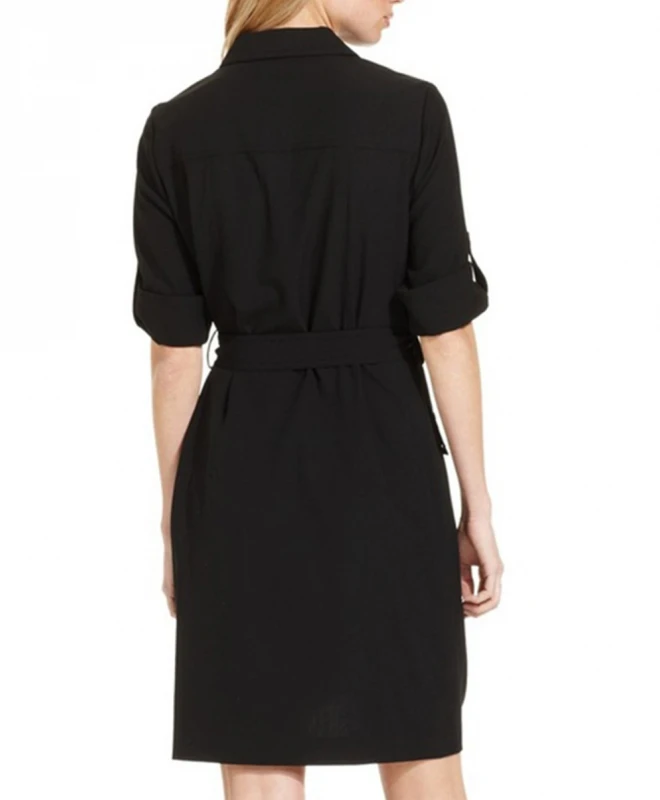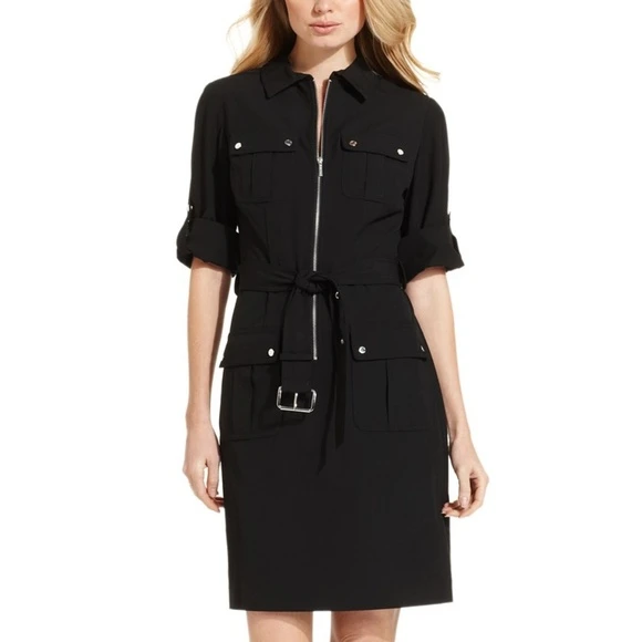 Robe Michael Kors Modèle Utility. Cette robe noire longueur genoux dispose d’un col à revers et de manches 3/4. Elle possède également une longue fermeture éclair, deux poches plaquées poitrine et deux plaquées tailles à rabats. Simple et élégante, vous pouvez également la porter au travail ! Elle est disponible à la location pour tout abonnement Une Robe Un Soir.