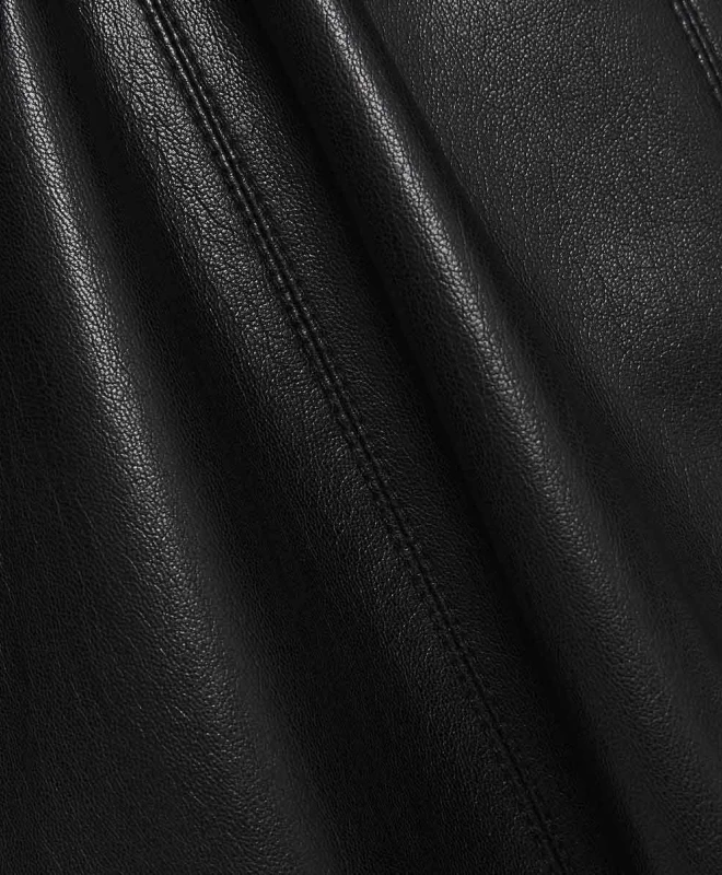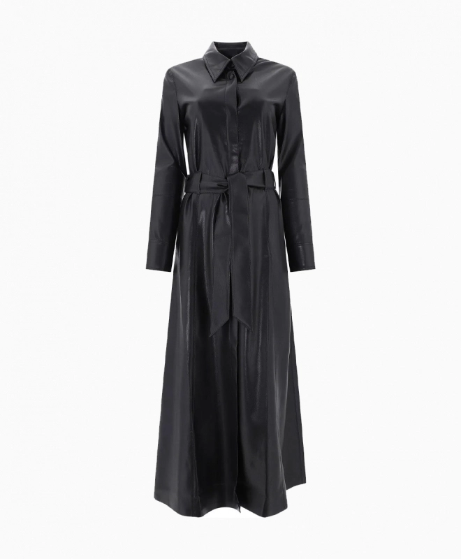 Robe Nanushka, modèle Tarot. Cette robe longue est en coupe trapèze avec un col tailleur et une ceinture intégrée. De couleur noire, à effet faux cuir et aux manches longues nous vous conseillons de la porter en hiver ou en automne avec un trench. Portez-la pour tous les jours au bureau ou simplement pendant le week-end pour vous balader. Osez des looks différents grâce à la location de vêtements en ligne.