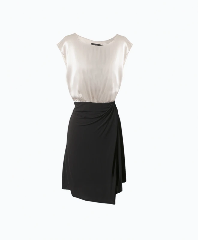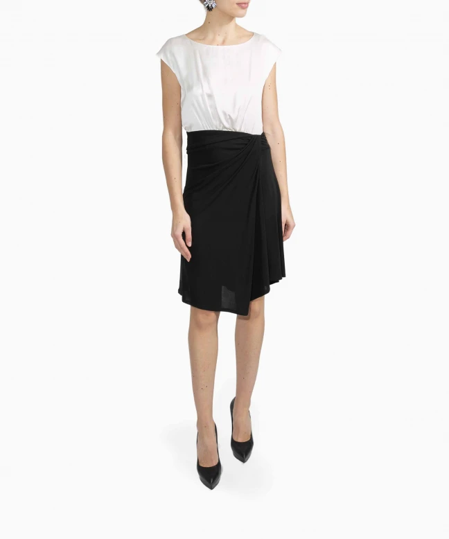 Robe PAULE KA modèle Emy. Cette robe midi est signée Paule Ka. La robe est bicolore, noire et blanche. La robe de la marque Paule Ka est sans manches. La robe Emy est à louer pour une soirée, un anniversaire, un cocktail.