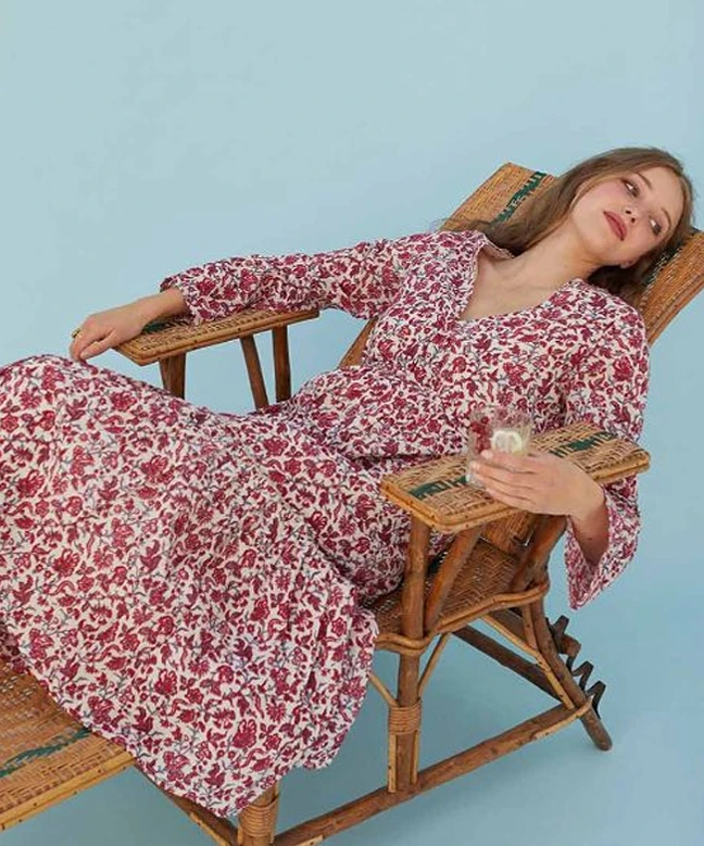 Robe Petite Mendigote, modèle Inaya. Cette robe longue à imprimé floral est à manches mi-longues qui vous donnera un style été et rafraîchissant. Elle a également un décolleté en V ce qui vous permettra de porter des colliers pour habiller votre coup. Accessoirisez-la d’un sacen raphia pour un look total été. Vous pouvez également la porter pour tous les jours au bureau avec une veste en jean bleu pour les temps plus frais. Cette robe est taille petit. Cette robe Petite Mendigote est disponible à la location par abonnement Une Robe Un Soir et à la location unitaire.