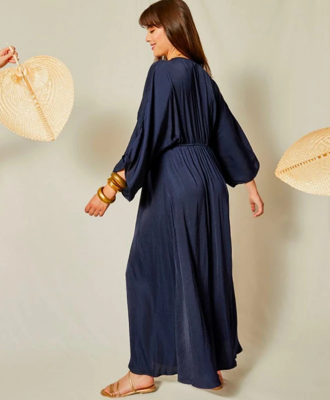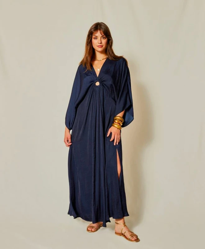 Robe Almé, modèle Alba Bleue. Cette robe longue dessine la silhouette grâce à un élastique dans le dos qui permet de cintrer la taille. Elle dispose d’une découpe à anneau sous la poitrine et de manches kimono permettant d’accentuer son côté fluide. Cette robe Almé est disponible à la location par abonnement Une Robe Un Soir et à la location à l’unité.