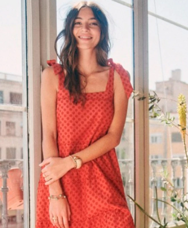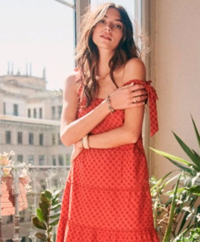 Robe Sézane, modèle Annie Sienne. Cette robe longue est couleur terre de Sienne avec des bretelles à nouer aux épaules et une patte de boutonnage dans le dos. Cette robe est doublée. Une robe pour cet été, associez-la à un sac en raphia ou tressé pour un look de vacance à la fois chic et confortable. Adoptez la nouvelle tendance écoresponsable de la location de vêtement grâce à l’abonnement.
