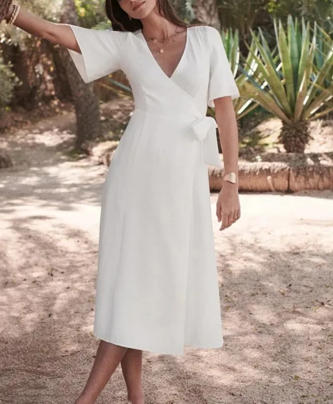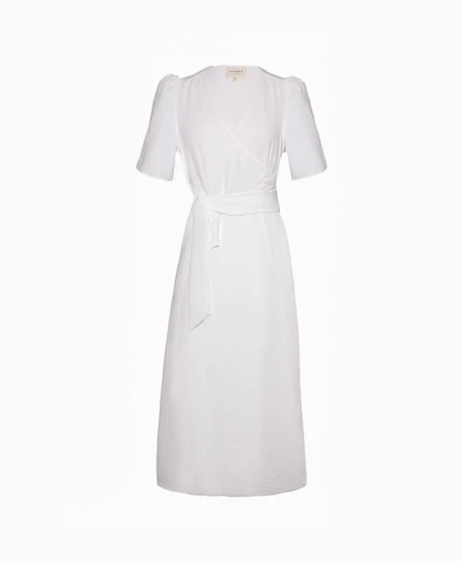 Robe Sézane, modèle Apolline. Cette robe est coupe midi, blanche et à manches courtes. Ses manches sont amples ce qui rajoutera de la fluidité dans vos mouvements. Elle est en coupe portefeuille avec une ceinture épaisse pour offrir un visuel de nœud plus imposant ce qui ajoute un accessoire chic et mignon. Osez la nouvelle tendance écoresponsable, la location de vêtements.