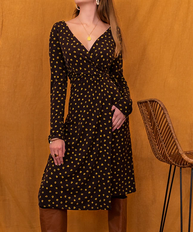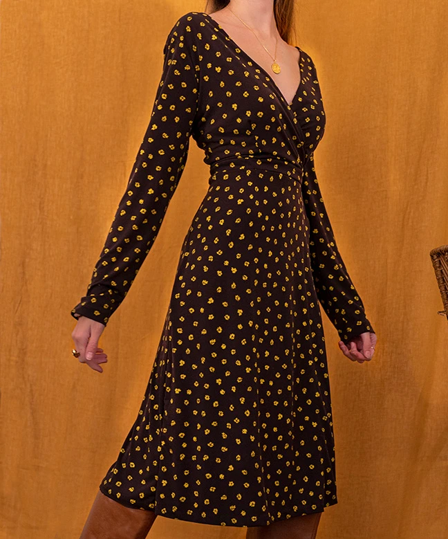 Robe Rachel ZOE, modèle Brown. Optez pour cette robe qui mettra en valeur votre silhouette. Ce modèle de la marque Rachel Zoe, dispose d’une coupe cache-cœur qui se noue à la taille. Elle est confectionnée dans un tissu de couleur brune à motif fleuri. La coupe portefeuille est flatteuse pour la taille et met en valeur l’encolure en V de ce modèle. Les manches sont longues et droites. Cette robe est disponible en location à l’unité ou avec l’abonnement Une Robe Un Soir.