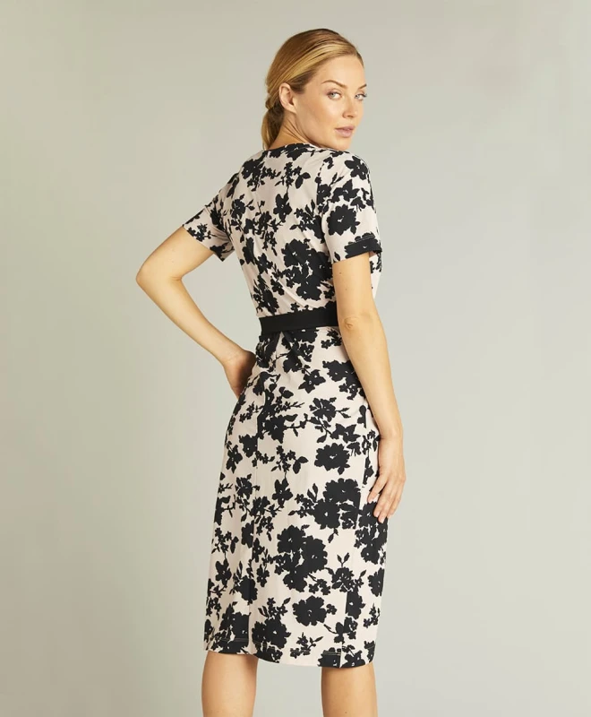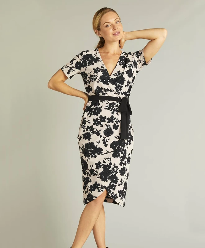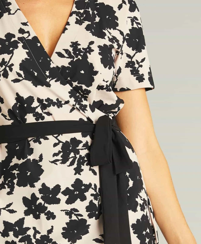 Robe Indies, modèle Confiante. Cette jolie robe manches courtes à imprimé paco fleuri noir et rose entièrement en jersey technique, possède un col cache-cœur. Grâce à sa ceinture nouable et à sa coupe cintrée, cette pièce affinera et marquera votre taille. Sa fente sur le bas ajoute une touche d’élégance à cette pièce. Cette robe taille normalement. Nous vous conseillons de prendre votre taille habituelle. Vous pouvez louer cette robe grâce à la box de vêtements Une Robe Un Soir ou à la location 4 jours.