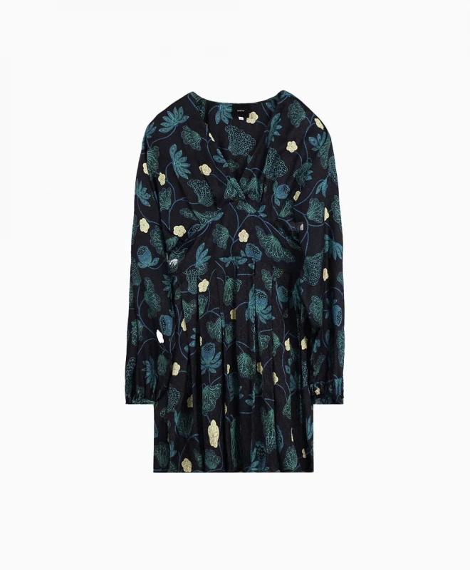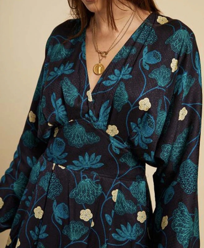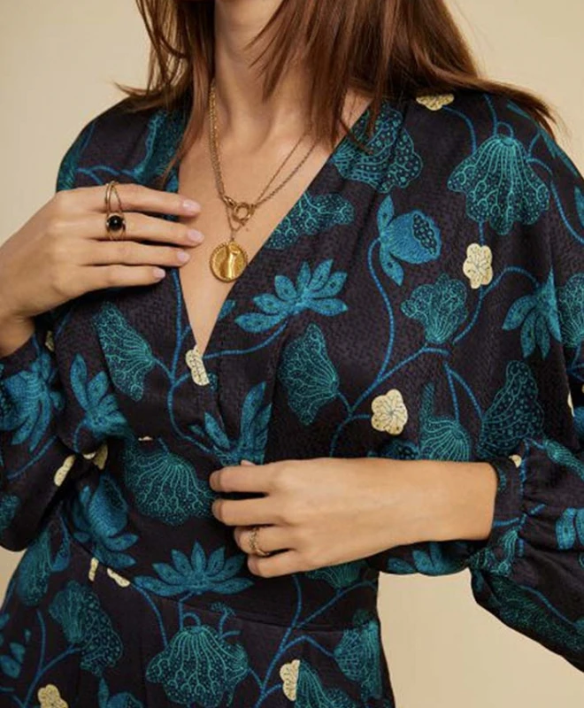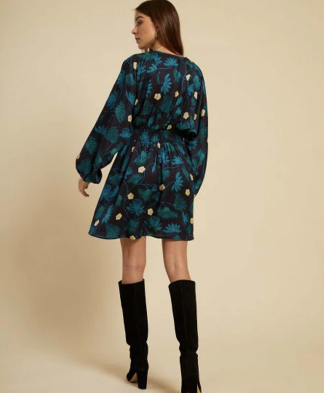 Robe Idano, modèle Darlène. Cette robe à motifs fleuris dispose de manches longues et bouffantes, resserrées au niveau des poignets. Elle est dotée d’un col V. Cette robe est cintrée à la taille et la jupe est évasée vers le bas. Idéale pour vos soirées entre amis, vous pouvez porter cette robe avec une paire de sandales ou bien des bottes à talons pour un look plus chic. Cette robe Idano est disponible à la location par abonnement Une Robe Un soir, et également à la location à l’unité.