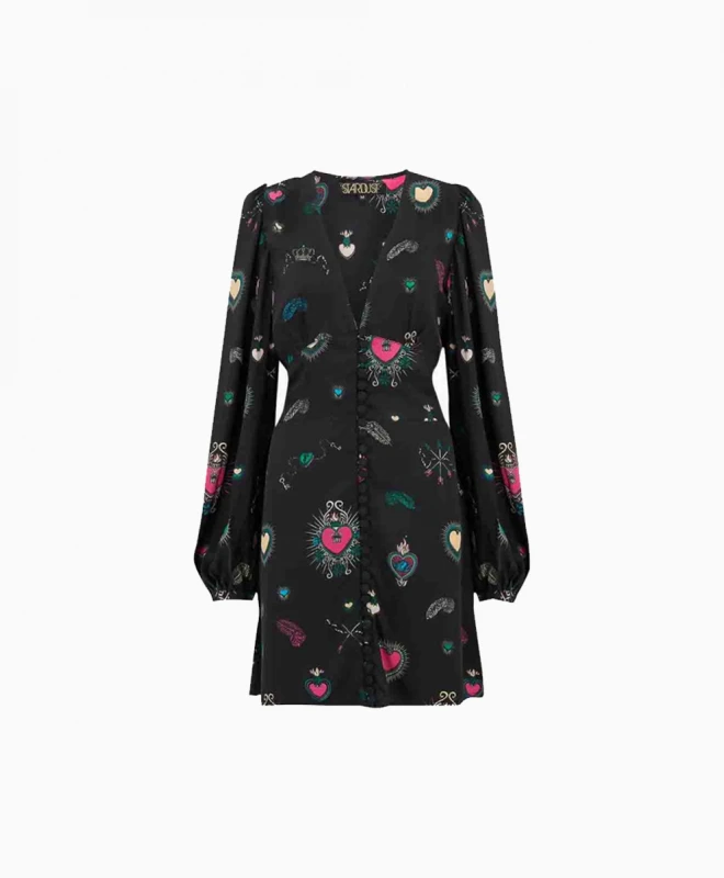 Robe Stardrust, modèle Diva Heart . Cette robe courte noir avec des motifs dĂ©calĂ©s multicolores doux. C’est une robe soyeuse, elle vous donnera un look rock toute en restant Ă©lĂ©gante. Elle est composĂ©e de manches longues avec poignets Ă©lastiquĂ©s et d’un dĂ©colletĂ© en V plongeant oĂą dĂ©marre une rangĂ©e de boutons qui descendent jusqu’en bas de la robe. Pour plus de fantaisie, un ruban se noue dans le dos pour former un nĹ“ud. Vous pouvez associer cette robe avec des bottines cloutĂ©es pour accentuer son cotĂ© rock. N’hĂ©sitez pas Ă la louer.