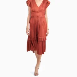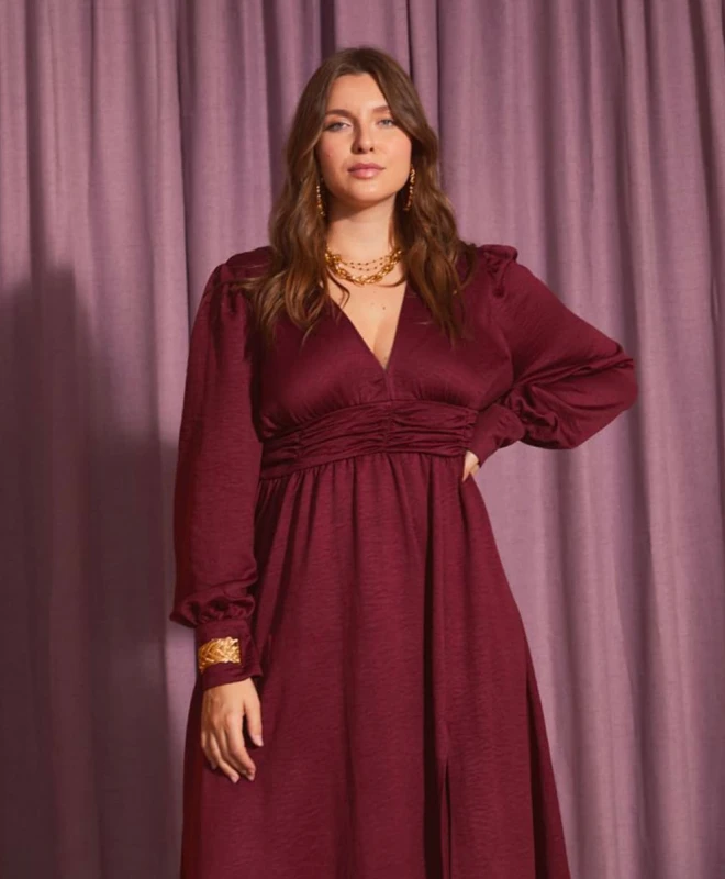 Robe AlmĂ©, modèle Eva. Cette robe longue dispose de manches longues Ă petites fronces et d’un dĂ©colletĂ© en V devant et dans le dos. Son jeu de plis sur la taille et son aspect smokĂ© dans le dos lui ajoutent une touche irrĂ©sistible qui vous rendra chic et sĂ©duisante. Cette robe AlmĂ© est disponible Ă la location par abonnement Une Robe Un Soir et Ă la location Ă l’unitĂ©.