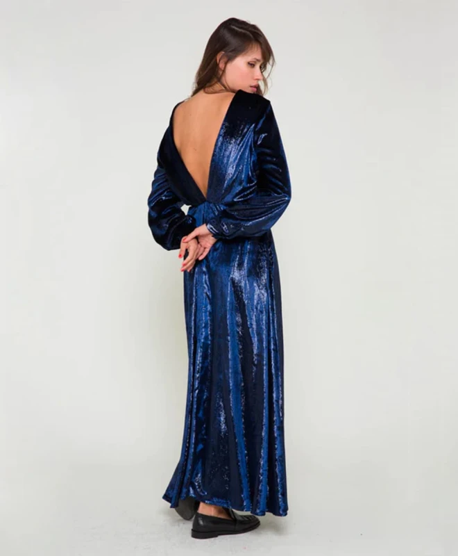 Robe Modetrotter, modèle Eymeline. Cette jolie robe de couleur bleu nuit dispose de manches longues, lĂ©gèrement bouffantes et resserrĂ©es au niveau des poignets. Elle est dotĂ©e d’un col bateau et d’un dos nu pour dĂ©voiler Ă©lĂ©gamment votre silhouette. Elle possède une ceinture Ă©lastique intĂ©grĂ©e pour souligner votre taille. Vous pouvez louer cette robe Modetrotter grâce Ă la box de vĂŞtements Une Robe Un Soir ou Ă la location 4 jours.