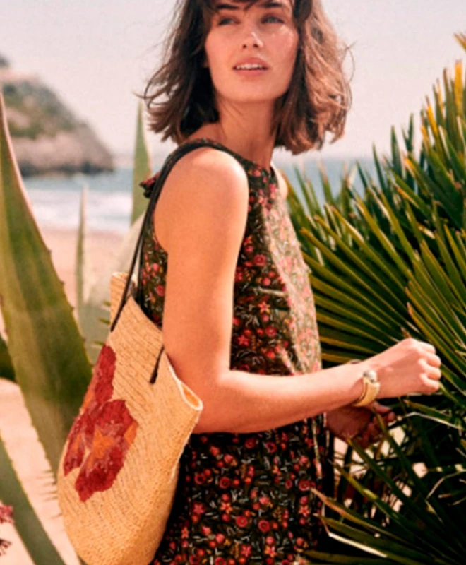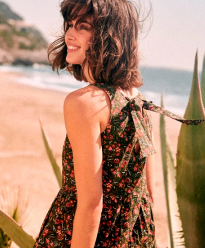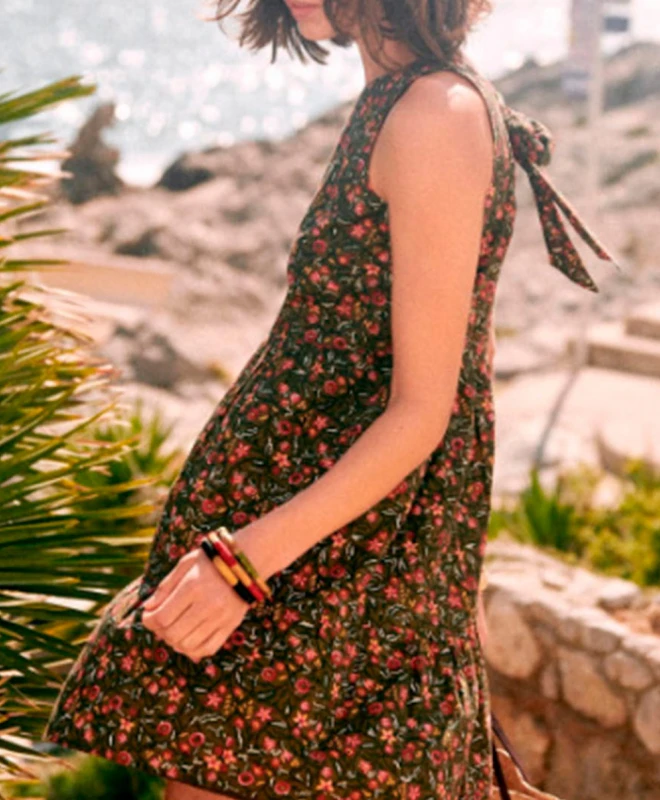 Robe Sézane, modèle Fifi. Cette robe courte sans manche a une encolure ronde sur le devant et en V dans le dos fermée par un nœud qui lui rajoute un côté fantaisie. Cette robe est idéale à la location pour votre box de vêtements du mois.