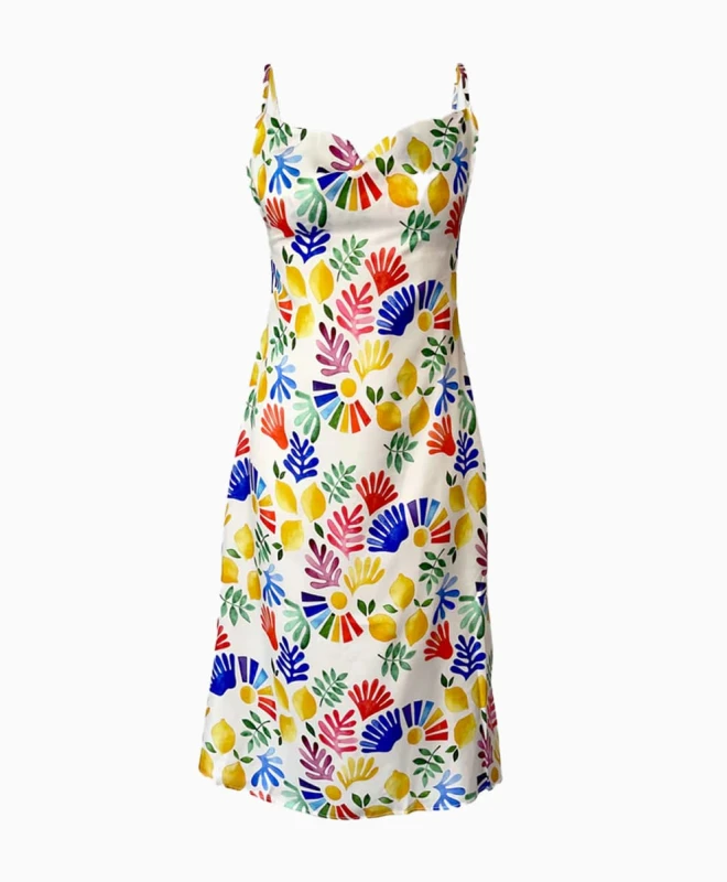Robe IKA Paris, modèle Flower. Cette belle robe est dotĂ©e d’un col bĂ©nitier et d’une coupe midi. Elle dispose d’un imprimĂ© très estival avec des citrons et des feuilles de diffĂ©rentes couleurs. Elle possède une fente partant du genou et des bretelles fines. Elle est confectionnĂ©e Ă la main Ă partir de matières Ă©co-responsables. Cette robe taille normalement. Toutefois, si vous avez une poitrine dĂ©veloppĂ©e, nous vous conseillons de sĂ©lectionner une taille au-dessus de votre taille habituelle. Vous pouvez louer cette robe IKA Paris Ă la box de vĂŞtement Une Robe Un Soir disponible Ă la location 4 jours.