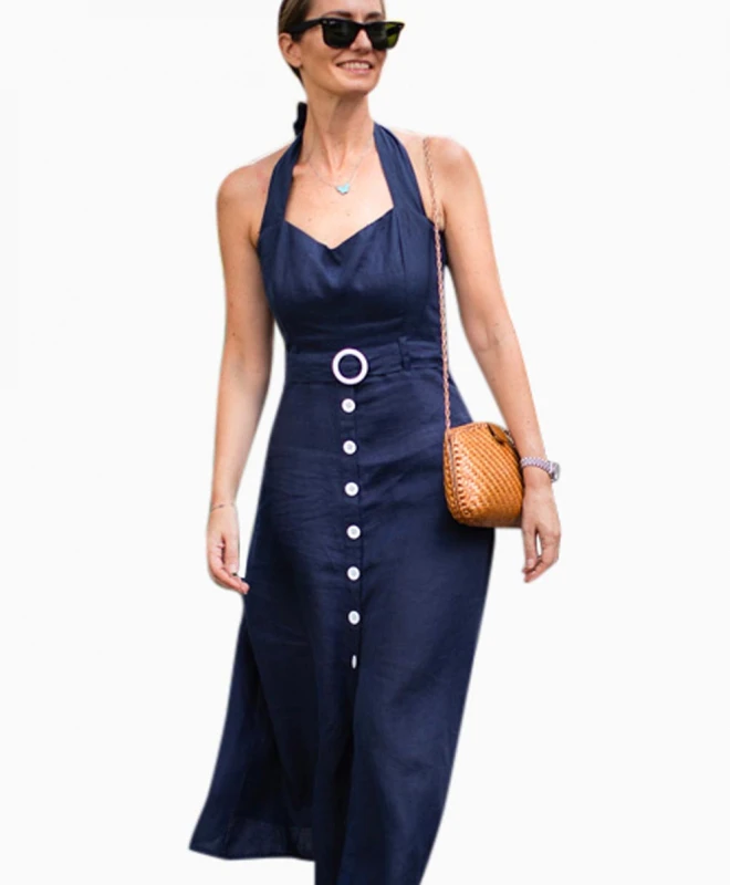 Robe PADDO TO PALMY modèle Halter. Cette robe signée Paddo To Palmy une jolie marque australienne est en lin afin de garantir un confort optimal. De longueur mi-longue et fendue sur le devant; ceinturée à la taille avec un décolleté noué au cou. Facile à porter, elle saura s’adapter à tout type d’événements. Paddo To Palmy est une marque australienne, connu pour leurs robes bohèmes et estivales. Une robe à louer pour l’été au bureau ou les vacances.
