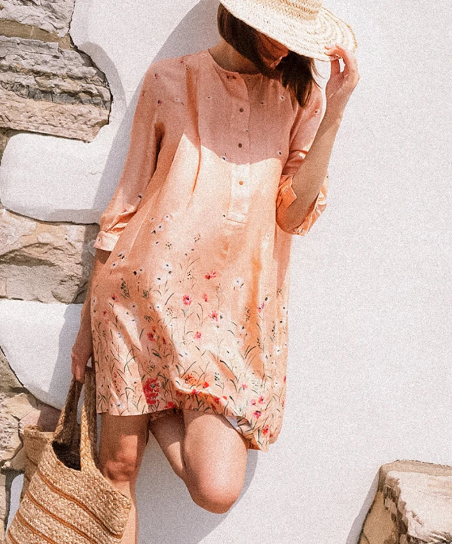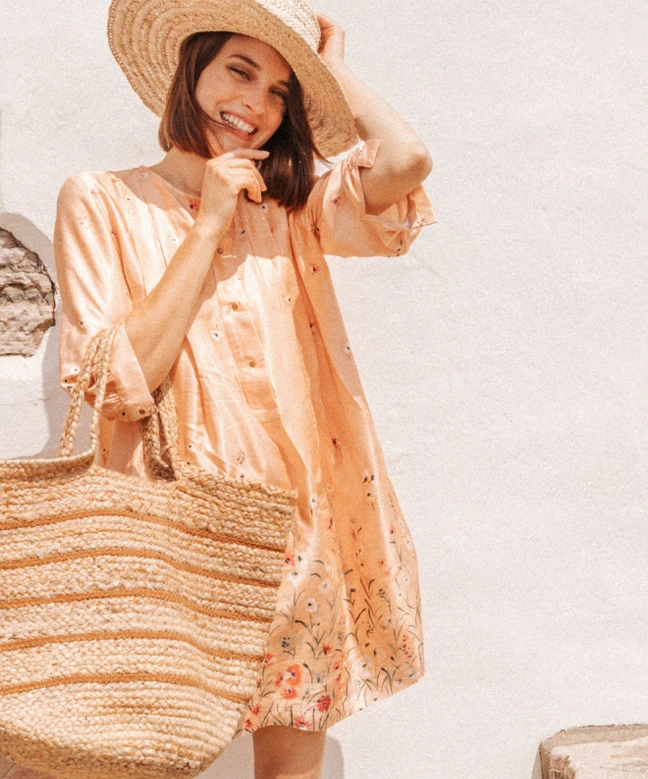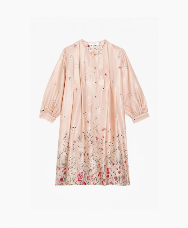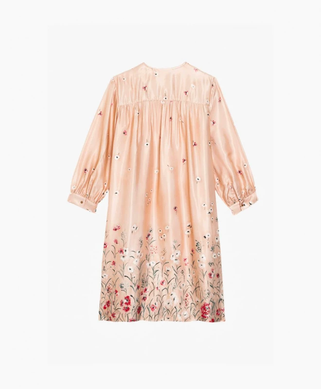 Robe Roseanna, modèle Happen Frigg. Une robe rose à imprimé floral et aux manches ballon resserré au bout. Une petite pièce courte facilement accessoirisable avec un chapeau en paille et un petit sac à main. Une pièce de choix à ajouter à votre sélection de location de vêtements.