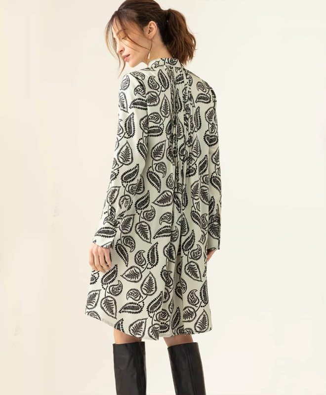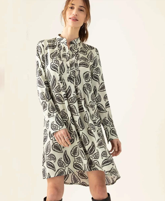 Robe Bleu Blanc Rouge, modèle Joe. Cette jolie robe noire et écrue à imprimé fleuri possède une coupe ample et droite. Sa fluidité et son effet satiné vous assurent une élégance à toute épreuve ! Cette pièce est dotée d’un col officier et de manches longues. Deux poches invisibles et des plis sur le devant dans le dos sont également présents sur la robe. Cette jolie robe se ferme avec des boutons cousus devant. Cette robe taille normalement. Nous vous conseillons de sélectionner votre taille habituelle. Vous pouvez louer cette robe Bleu Blanc Rouge grâce à la box de vêtements Une Robe Un Soir ou à la location 4 jours.