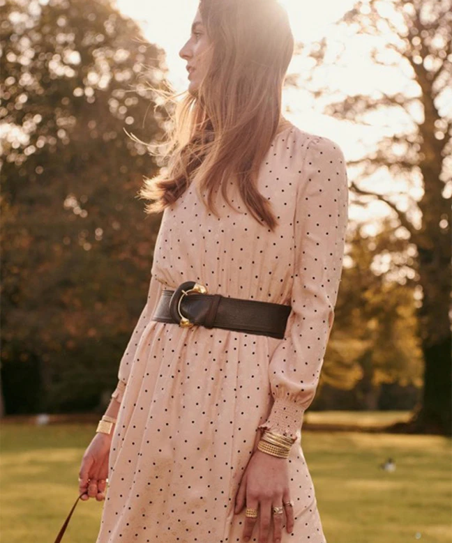 Robe Sézane, modèle Justine à pois. Cette jolie robe aux tonalités nude apportera une touche de légèreté à votre dressing. 100 % soie, manches longues smockées à la taille, vous allez adorer la louer. En plein hiver associez la à un pull de la même marque et de jolies bottines bordeaux ! Le plus de cette robe, le détail ultra féminin de gouttes boutonnées au dos. La robe est disponible à la location pour tout abonnement Une Robe Un Soir.