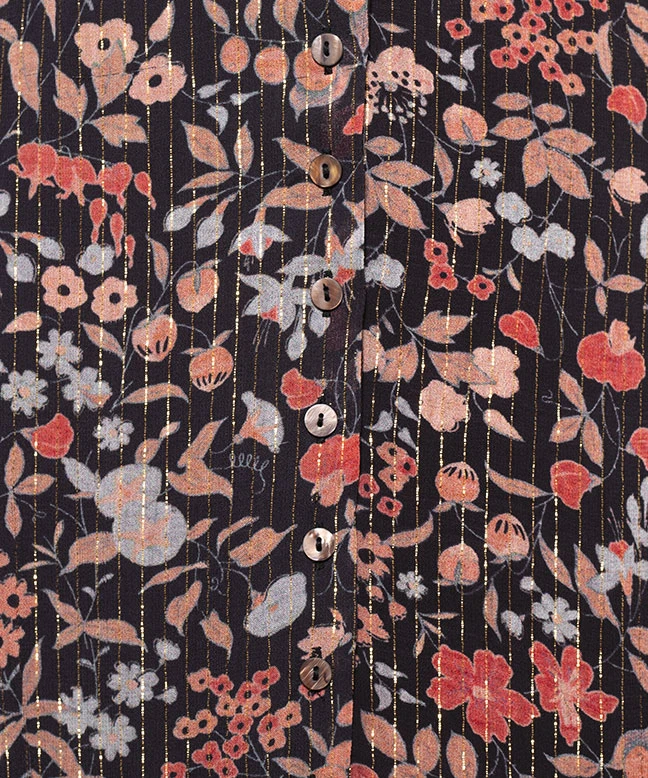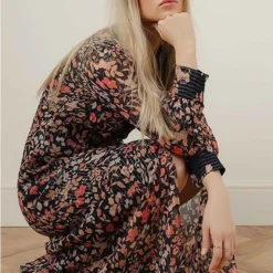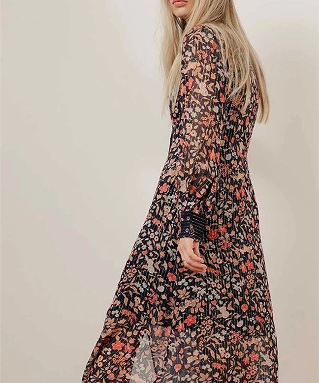Robe Lily & Lionel, modèle Karen. Cette robe noir avec des imprimés floraux rose et bleu et des lignes en fils métallique doré, dispose de manches longues transparentes avec pattes de boutonnages au poignet et sur tout le devant de la robe avec des boutons apparents et un col en V. Elle joue avec l’opacité et la transparence, ce qui la rend très féminine et originale. Elle peut être ceinturée à la taille, ce qui donnera à la personne qui la porte une silhouette flatteuse et élégante, ceinture non fournie. Louer des pièces avec des imprimés originaux et changer de style facilement grâce à la location de vêtements.