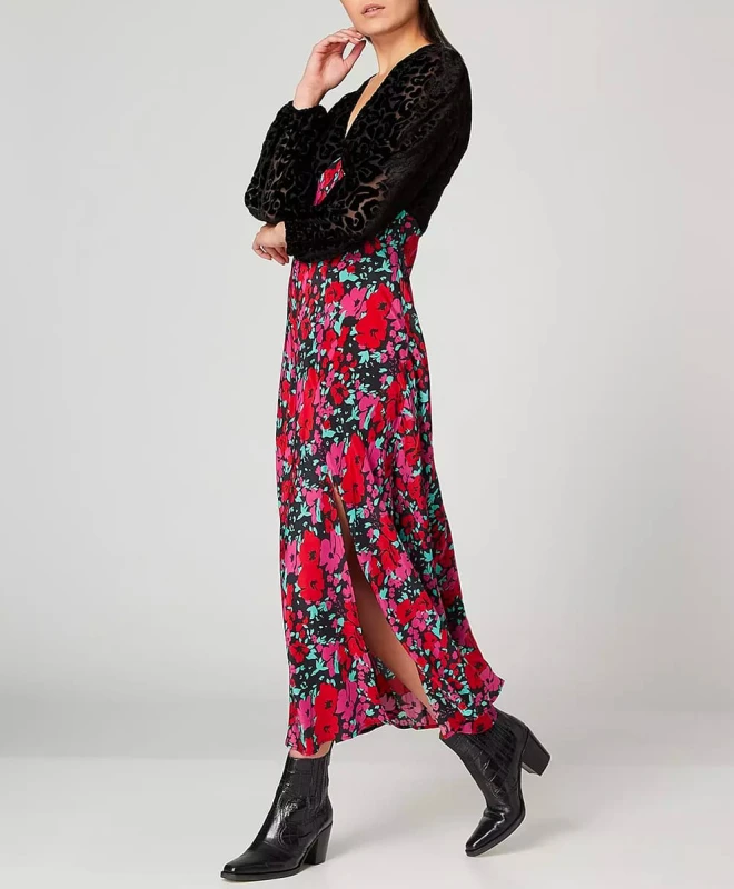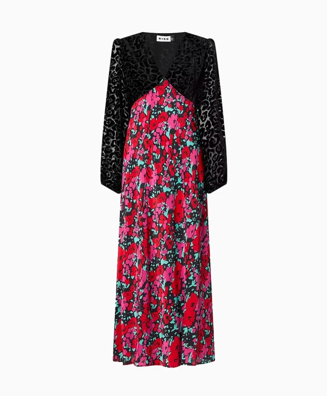 Robe Rixo, modèle Melanie. Cette robe Ă©lĂ©gante possède deux manches longues transparentes resserrĂ©es au poignet. De beaux imprimĂ©s panthère en velours sont prĂ©sents sur les manches pour ajouter de l’originalitĂ© de la robe. Elle est dotĂ©e d’une jupe Ă©vasĂ©e et lĂ©gère aux imprimĂ©s fleuris qui viendra mettra votre silhouette en valeur. Cette robe Rixo est disponible Ă la location par abonnement Une Robe Un Soir et Ă la location Ă l’unitĂ©.