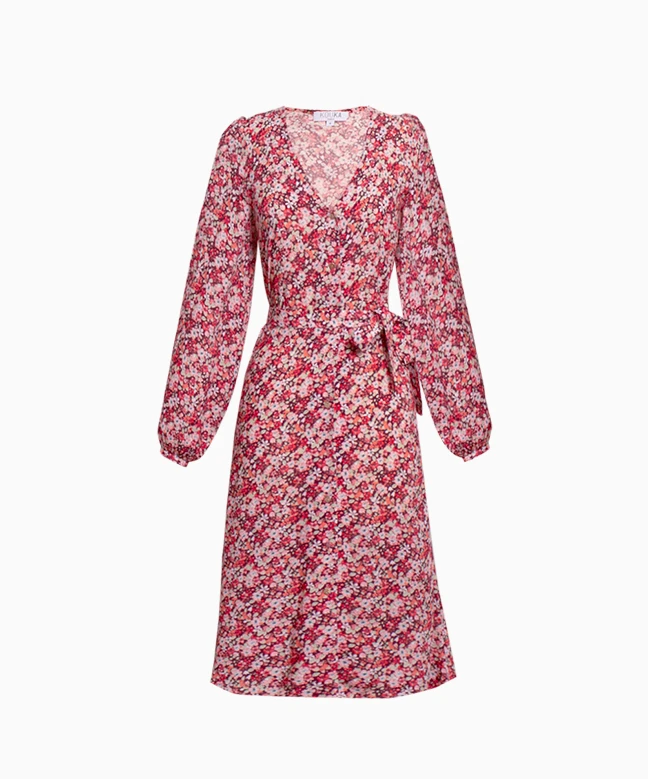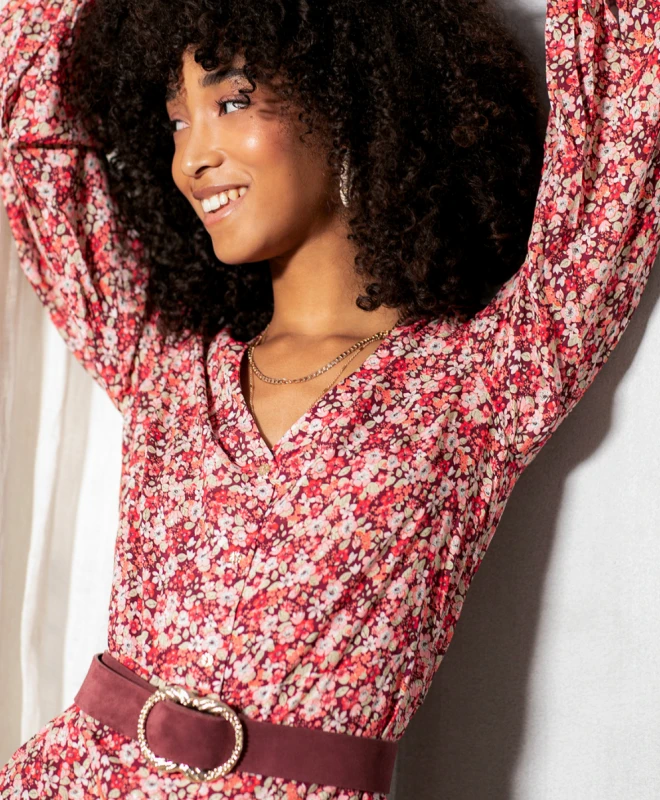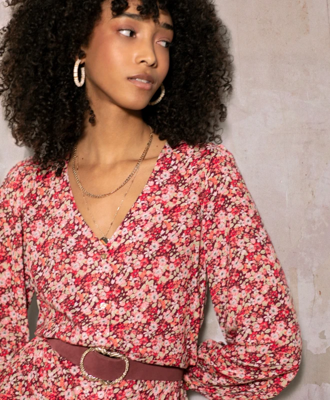 Robe PNL, modèle Bordeaux Grace. Cette robe dans les tons corail, dispose d’un joli col V et de longues manches boutonnées. Cette robe est cintrée grâce aux liens à nouer à la taille et à sa fermeture boutonnée. La robe est disponible à la location avec l’abonnement Une Robe un Soir.