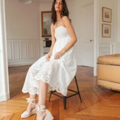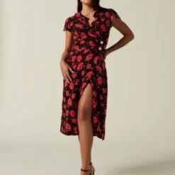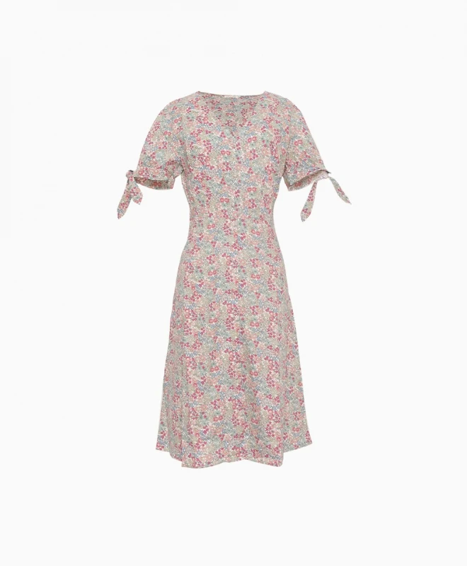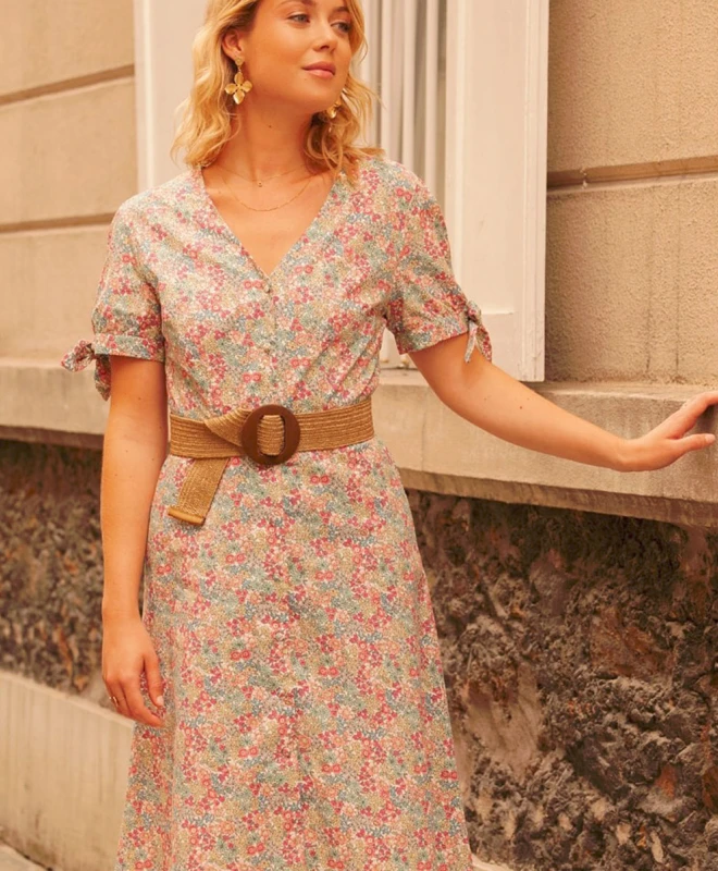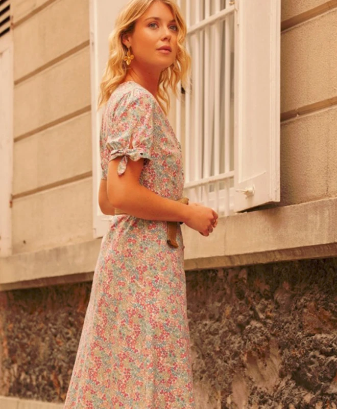 Robe PNL, modèle Ninette. Cette robe dans les tons roses et bleus, dispose d’un col en V et de manches courtes. Cette robe doublĂ©e Ă l’origine Ă©vasĂ©e est dotĂ©e de liens Ă nouer et se ferme Ă l’aide de boutons. Dessinez votre silhouette en la portant avec une ceinture dans les tons clairs. La robe est disponible Ă la location pour tout abonnement Une Robe Un Soir.