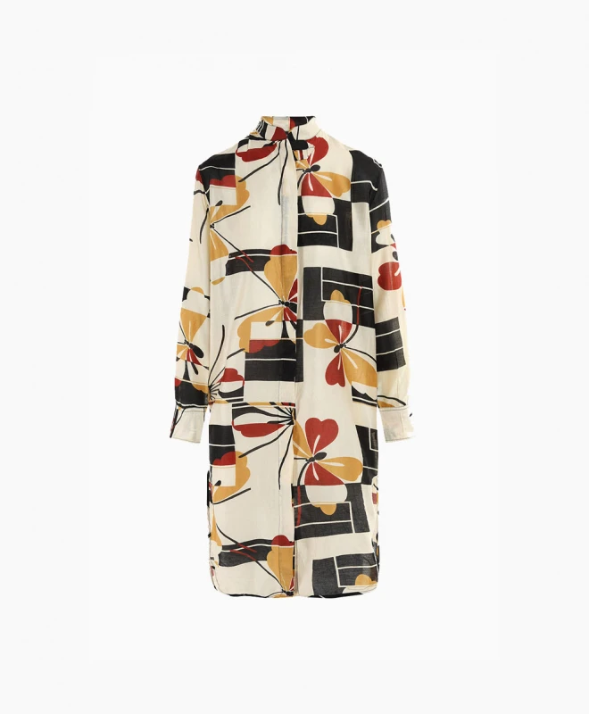 Robe Laurence Bras, modèle Picasso Butterfly. Cette robe est longue à imprimé avec un boutonnage de haut en bas de la pièce, une pate sur le col et une fente sur les deux côtés. Une robe graphique à l’imprimé original à louer pour le bureau ou accessoirisée pour un cocktail ou une sortie.