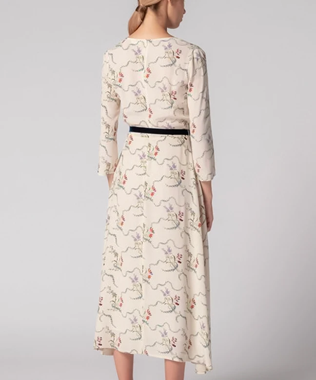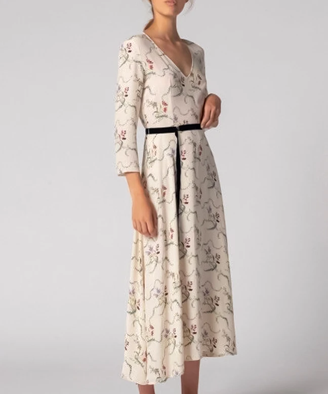 Robe Pablo, modèle Romance. Cette robe de Pablo de couleur crème est très élégante. Sa forme légèrement cintrée avec un col V et des manches 3/4 mettrons en avant votre silhouette. L’imprimé du tissu est fleuri et dans le style bohème. Modernisez cette robe avec une belle ceinture de notre abonnement et une paire de basket. Osez la mode durable avec l’abonnement Une Robe Un Soir ou la location à l’unité.