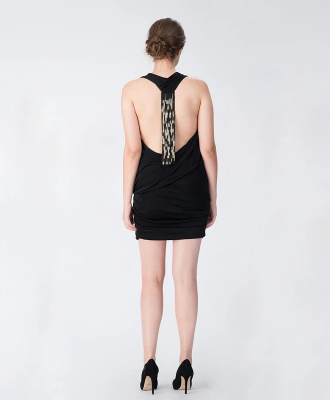 Robe Jay Ahr, modèle dos nu. Cette robe en jersey stretch, encolure asymétrique et dos nu dispose de bande recouverte de fines chainettes de métal argent et bronze.