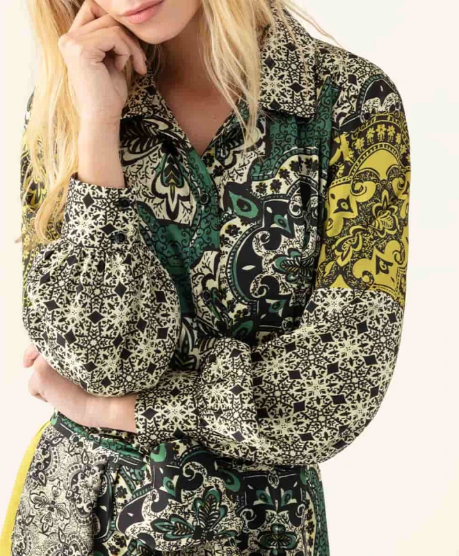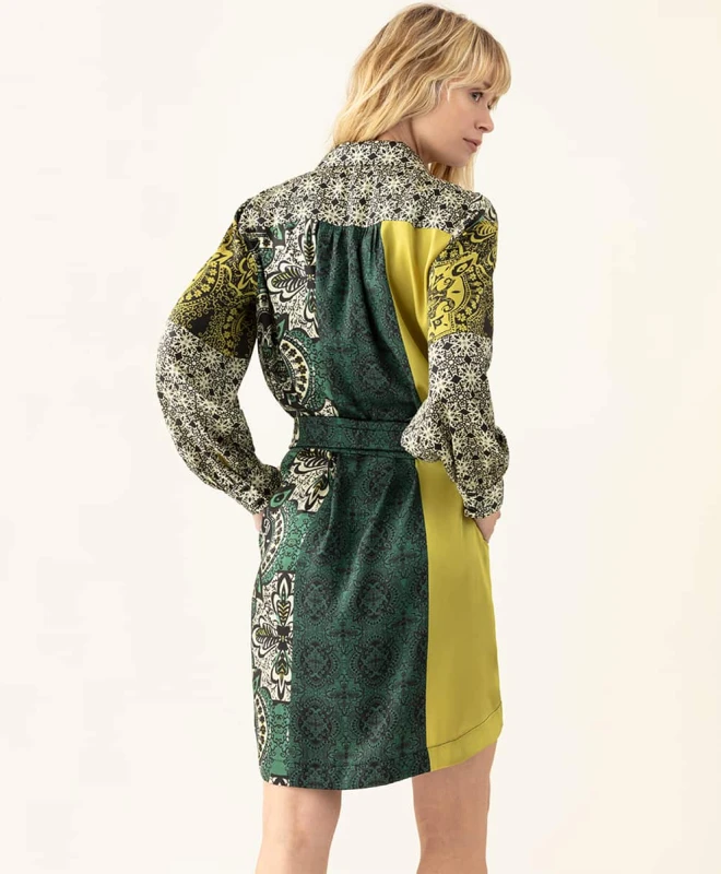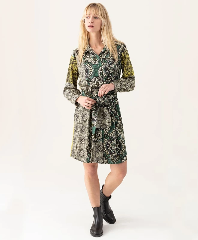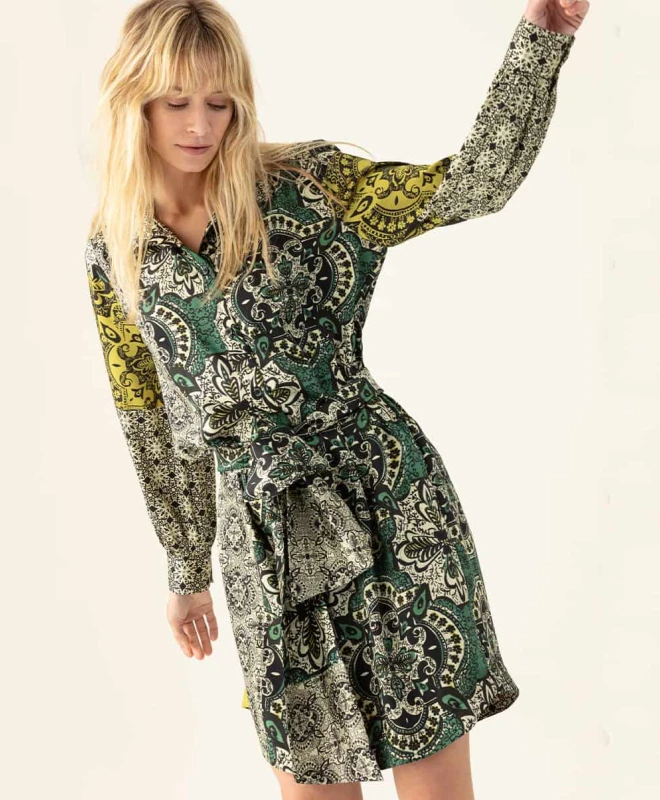 Robe Indies, modèle Valmy Marrakech. Cette jolie robe à imprimés, inspiration marocaine, possède une coupe droite et un col chemise. Elle est dotée de manches longues et se ferme par boutonnière présente de tout son long. La robe dispose d’une ceinture large amovible et de poches dissimulées de chaque côté de la robe. Cette robe taille normalement. Nous vous conseillons de prendre votre taille habituelle. Vous pouvez louer cette robe grâce à la box de vêtements Une Robe Un Soir ou à la location 4 jours.