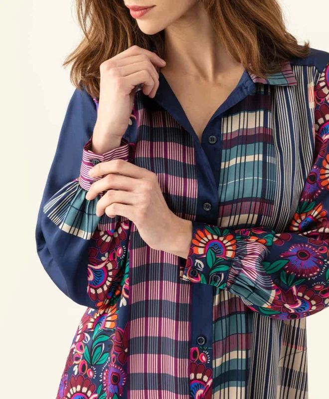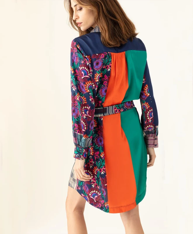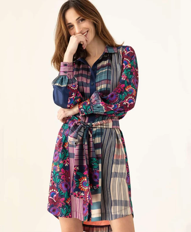 Robe Indies, modèle Valmy Singapour. Cette jolie robe courte à imprimés fleuris et graphiques possède une ceinture amovible qui marquera votre taille. Sa matière fluide et sa coupe droite ajouteront un côté féminin à votre tenue. Cette robe aux manches longues est également dotée d’un col chemise et de détails froncés au milieu du dos. Elle se ferme avec des boutons. Cette robe taille normalement. Nous vous conseillons de prendre votre taille habituelle. Vous pouvez louer cette robe Indies grâce à la box de vêtements Une Robe Un Soir ou à la location 4 jours.