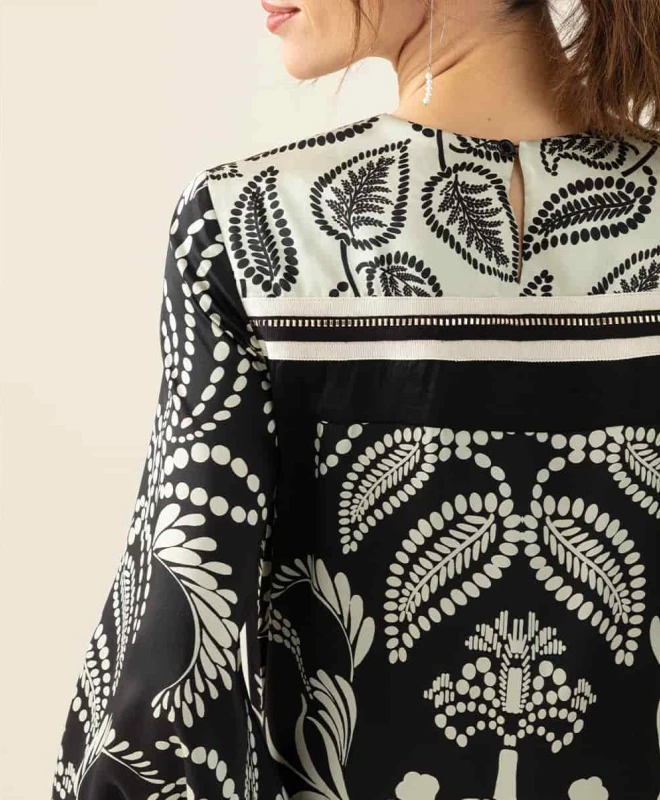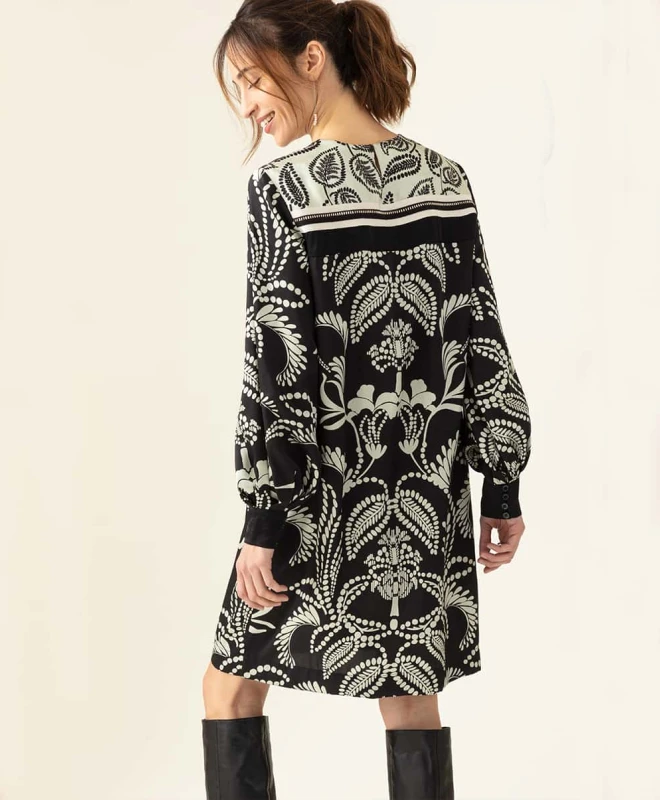 Robe Bleu Blanc Rouge, modèle Versailles. Cette jolie robe fluide et satinée à imprimé floral original noir et blanc possède des manches longues. Idéale en journée comme en soirée, cette pièce au col rond et à la coupe droite est élégante à souhait ! Elle dispose également de deux poches invisibles. Cette robe taille normalement. Nous vous conseillons de sélectionner votre taille habituelle. Vous pouvez louer cette robe Bleu Blanc Rouge grâce à la box de vêtements Une Robe Un Soir ou à la location 4 jours.