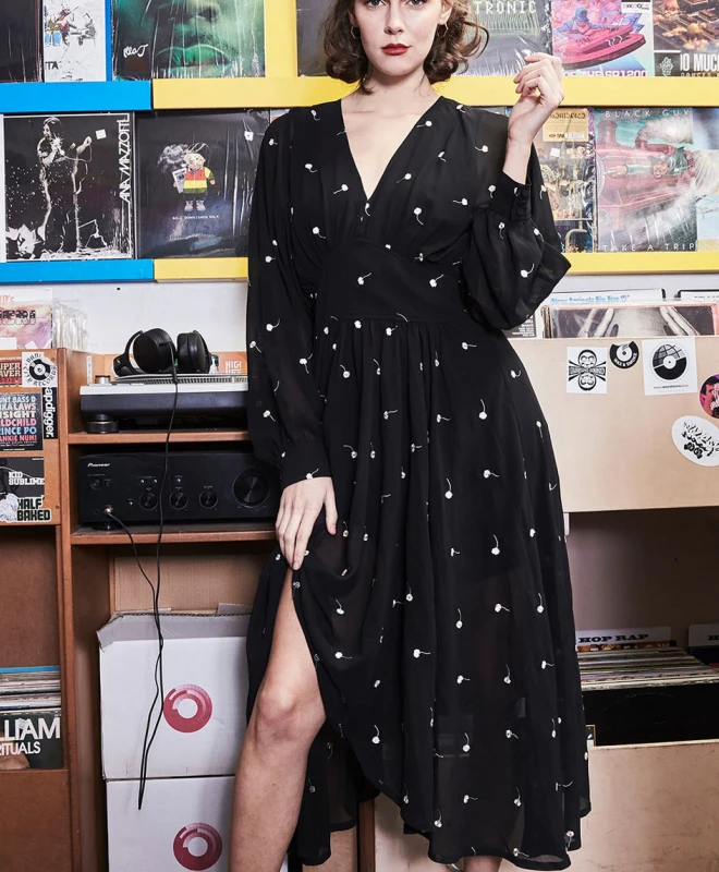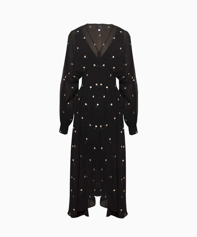 Robe IDANO modèle Violette. Cette robe longue de couleur noire Ă motifs, est dotĂ©e d’un lĂ©ger dĂ©colletĂ©. La robe est cintrĂ©e par une couture en dessous de la poitrine, elle est aussi asymĂ©trique sur le bas de la robe avec un effet fluide. La robe est disponible Ă la location par abonnement Une Robe Un Soir.